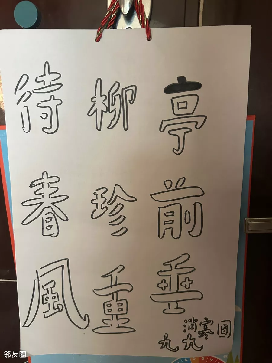 数九第一天,孩子如期画好了他的消寒图,挂在门口,今早上学前不忘加上一笔。不过今年画的不是梅花,改字了