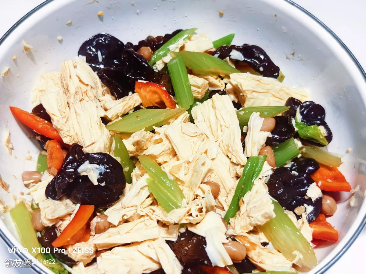 花生米拌腐竹,里面还加了木耳,甜椒和芹菜
