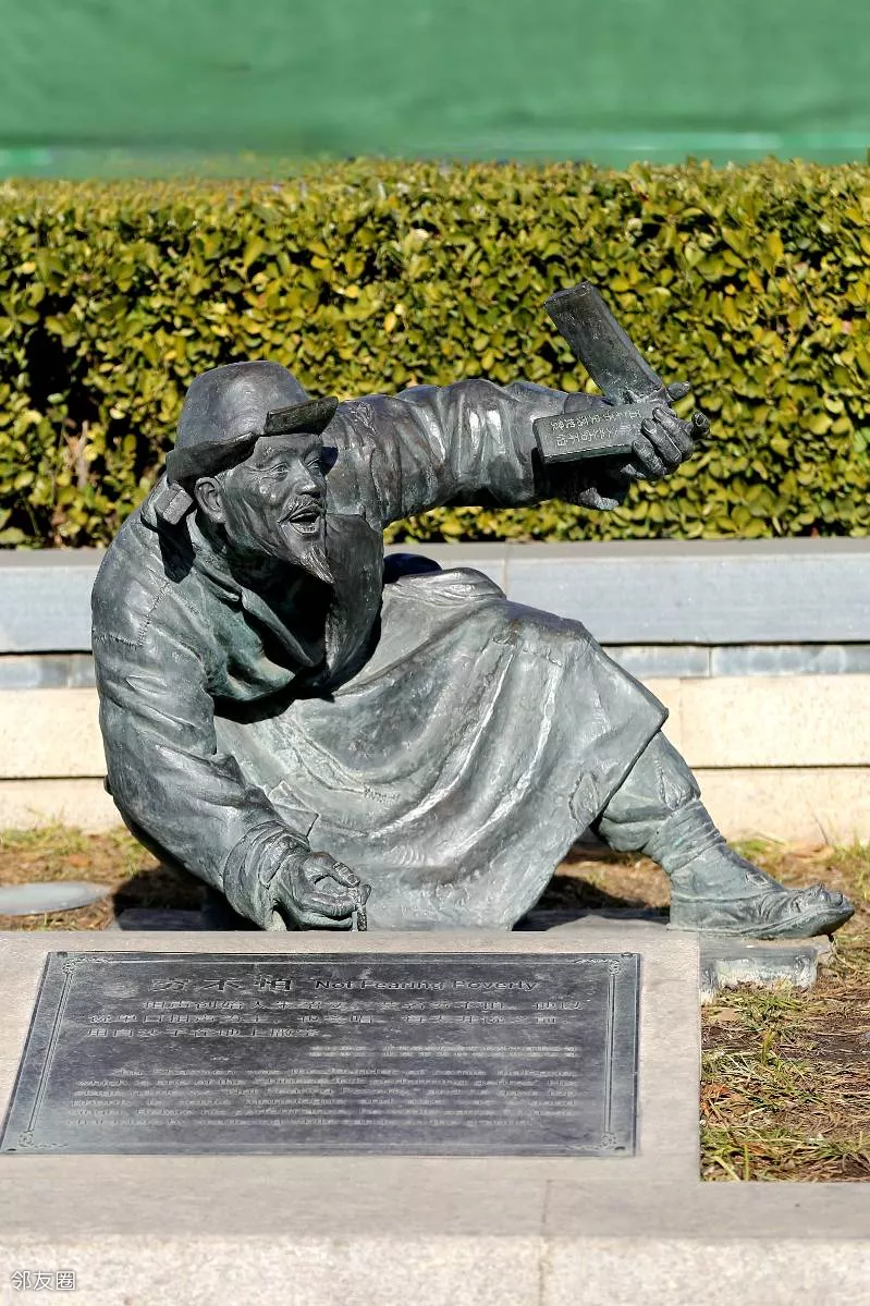 天桥八绝之穷不怕塑像。穷不怕是相声的创始人,本名朱绍文。他以说单口相声为主,也会唱。每天开说之前,先用白沙子在地上撒字儿。