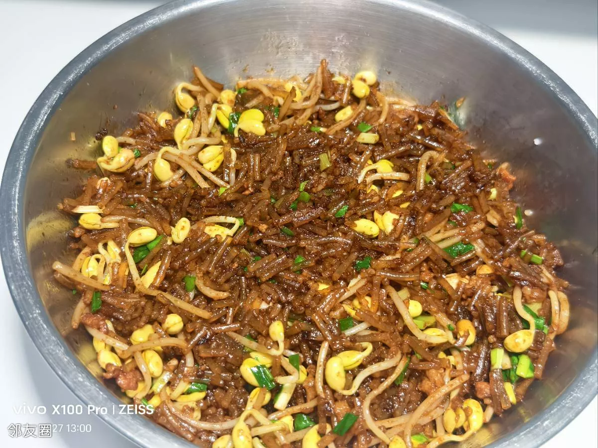 豆芽去根洗净,粉条泡软后控干水分放老抽调色,放花椒油防粘,锅里放少许油下葱花爆香后放豆芽炒一下,接着把粉条放进去煸炒,调味就放点生抽老抽十三香松鲜鲜少许盐还有一点点辣的辣椒面,扒拉扒拉就可以了,放凉后再包!