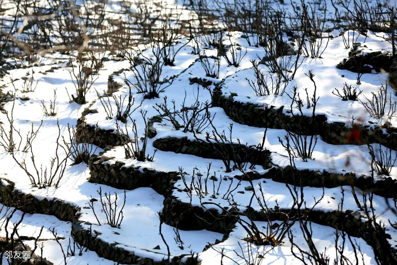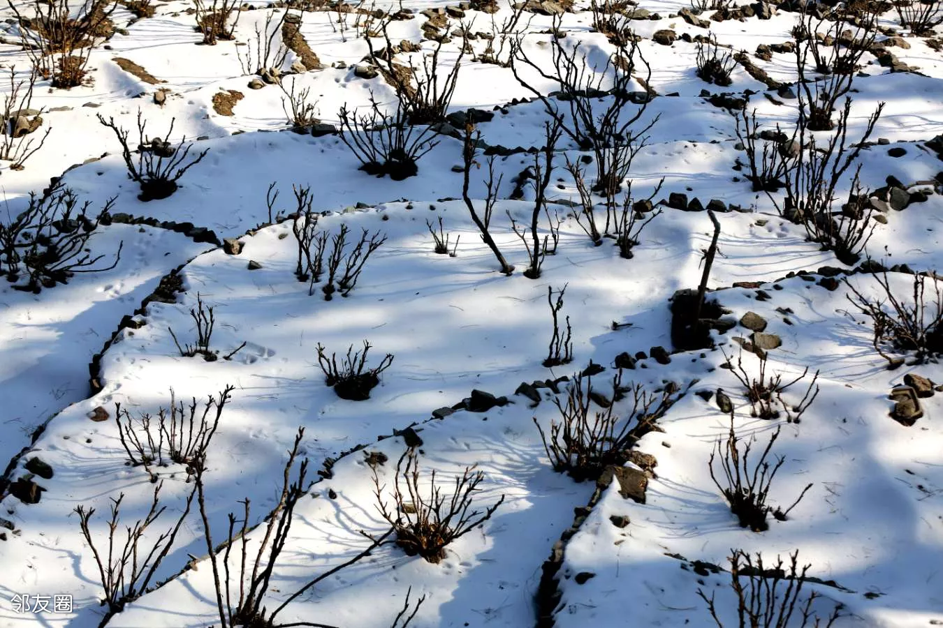 牡丹花田里的雪,只被风和阳光亲近过,跟刚下的似的,还是那么洁白、暄软,完美得要命。像一床厚厚的棉被,盖在牡丹树上,既给它温暖,又给它滋润。只待春归,便开放满园的绚烂。
