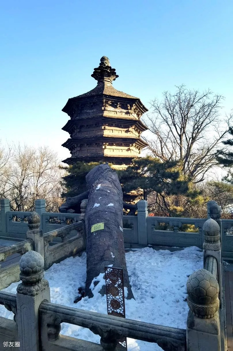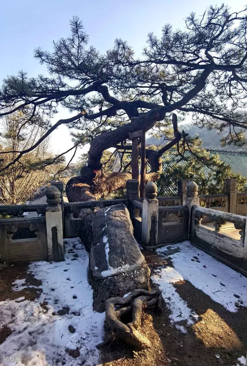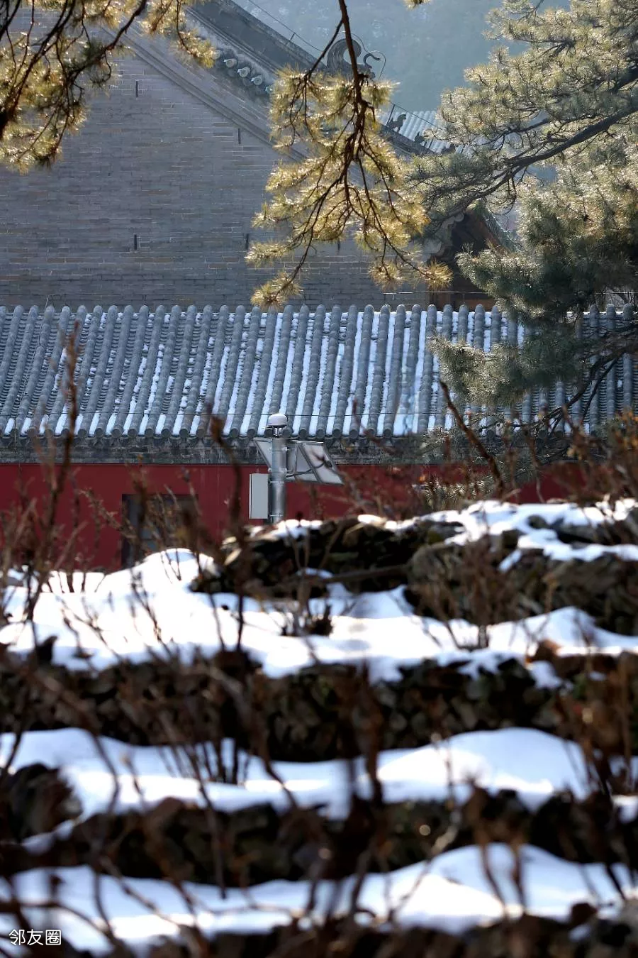 寺中有的是千奇百怪的松,而松和雪恰似一对最佳拍档。他俩联袂而至的时候,雪不再是雪,而是圣洁;松也不再是松,而是风骨。