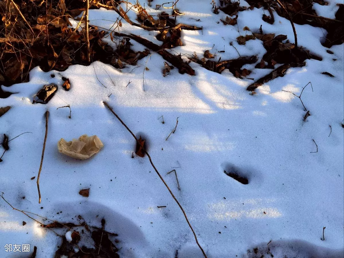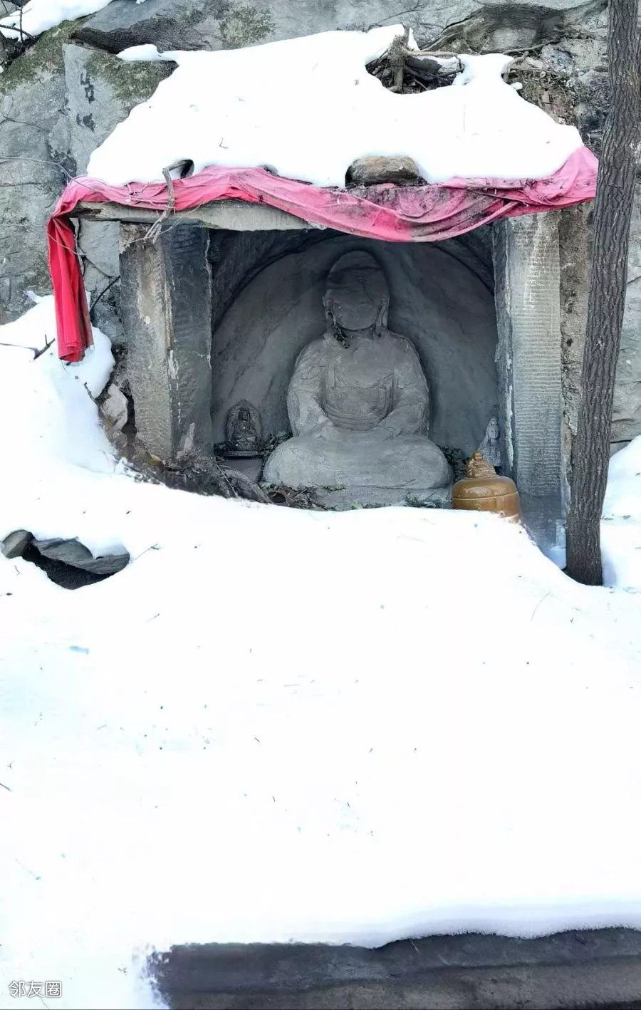 登山道旁,一个隐蔽的背阴处有一个浅浅的、几乎被雪淹没的佛龛,一尊年代久远的佛像端坐其中,令人望而生敬。也许,常常来此参拜的香客年龄大了,许久、最起码下雪之后没有来过,神像前的雪上没有任何痕迹。我远远地行个注目礼,悄然离去。