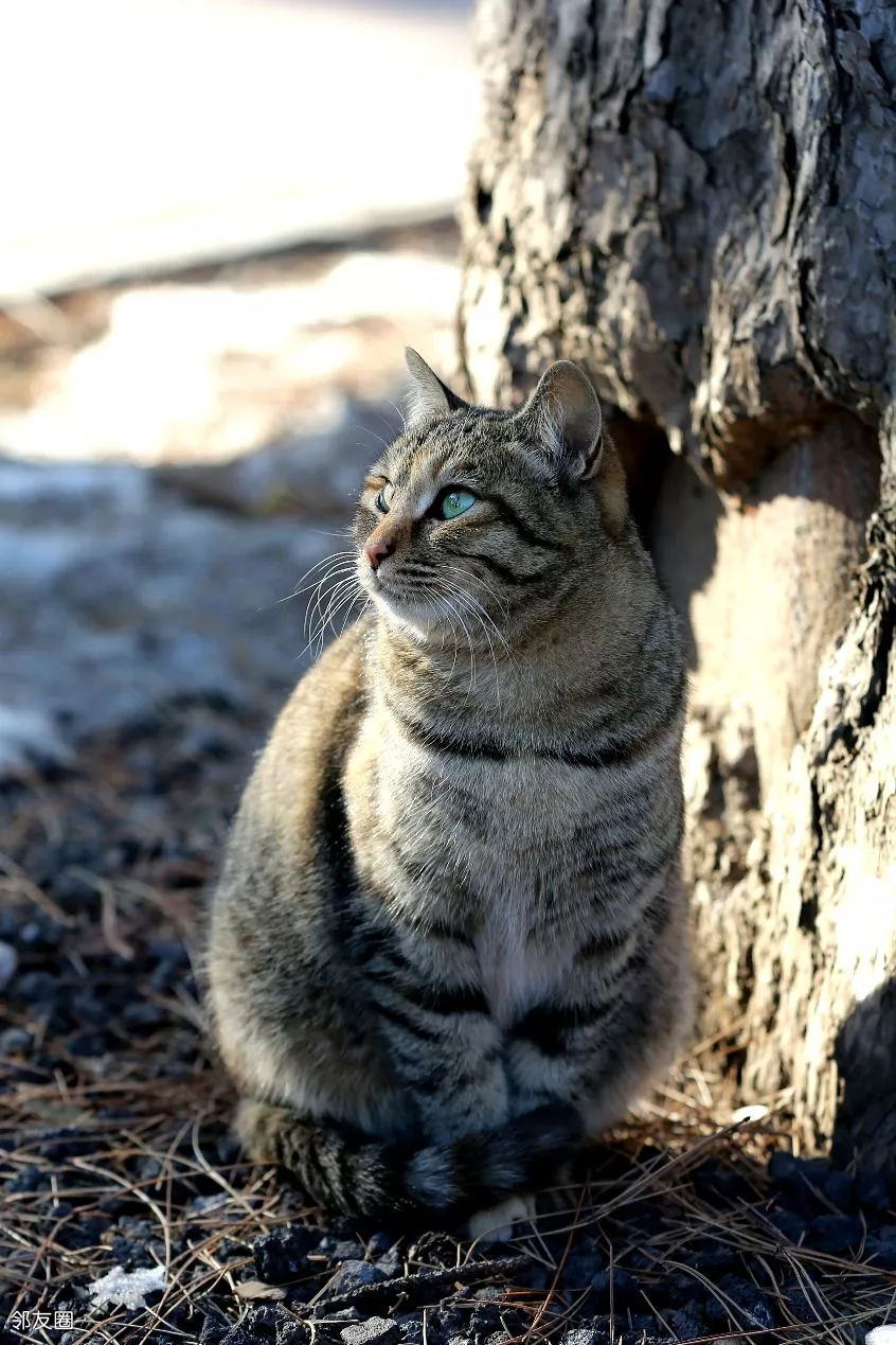在老松根旁,堆积在一起的雪融化出一小块儿空地,一只狸猫端坐在那里晒太阳。它表情矜持、目空一切,仿佛来自佛国,不用正眼看任何人。这应该是无人豢养的流浪猫,就因为流浪在寺庙,就与众不同。它是我见到过的最干净、最体面的流浪猫。