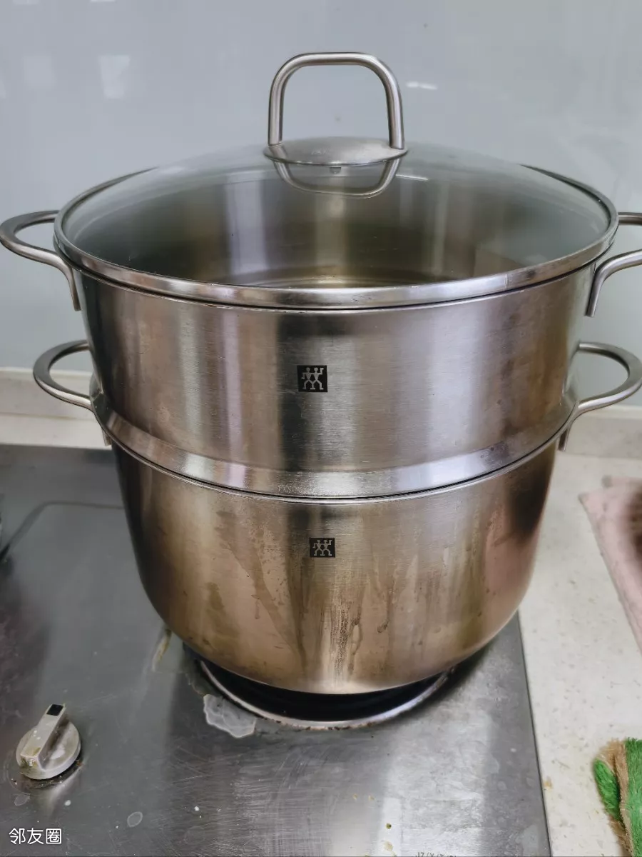 家里普通的钢蒸锅如果烧干了结果不敢想象。中午热完了馄饨,吃完饭就出去了。下午四点多回来突然发现燃气灶还着着,那钢蒸锅就在上面一点事也没有。奇迹啊,原来还是德国的锅质量经得住考验啊。赶紧看看锅上有两个小人,是双立人牌的。太不可思议了吧!