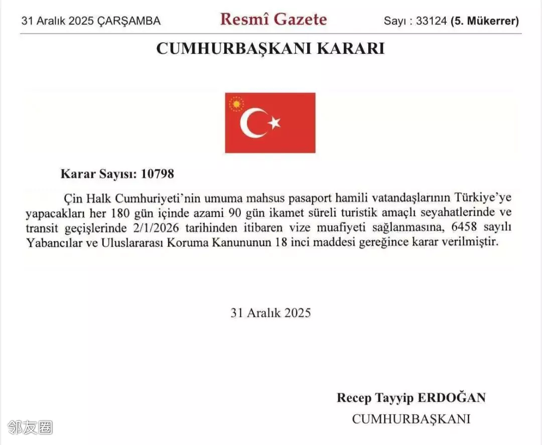 土耳其《官方公报》发布总统令,宣布自2026年1月2日起,对持中国普通护照的公民实行免签入境政策。