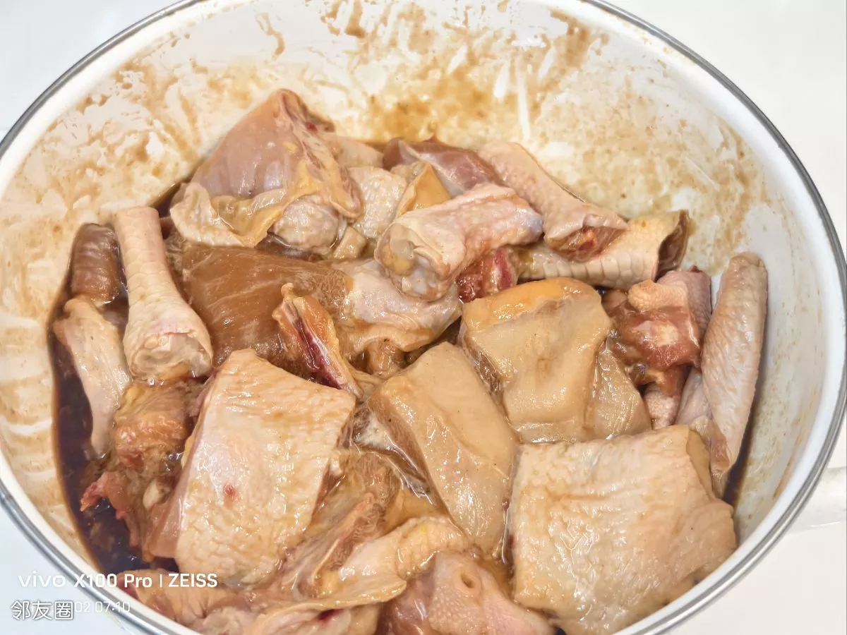 大公鸡三斤多,收拾完了也就剩两斤半吧,切成适合自己吃的块即可,先把鸡肉腌制一下入个底味儿,放蚝油,胡椒粉,酱油,姜粉(好多人都不爱吃姜,但是放姜粉就特别适合,口感上吃不出来,但味道也提香了)适量,抓拌均匀,要让佐料充分的吃进去,再来点淀粉上浆,喷油封上腌制十五分钟左右!