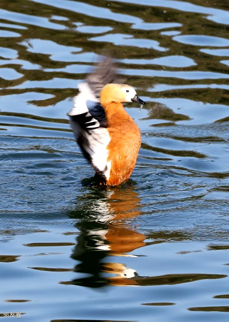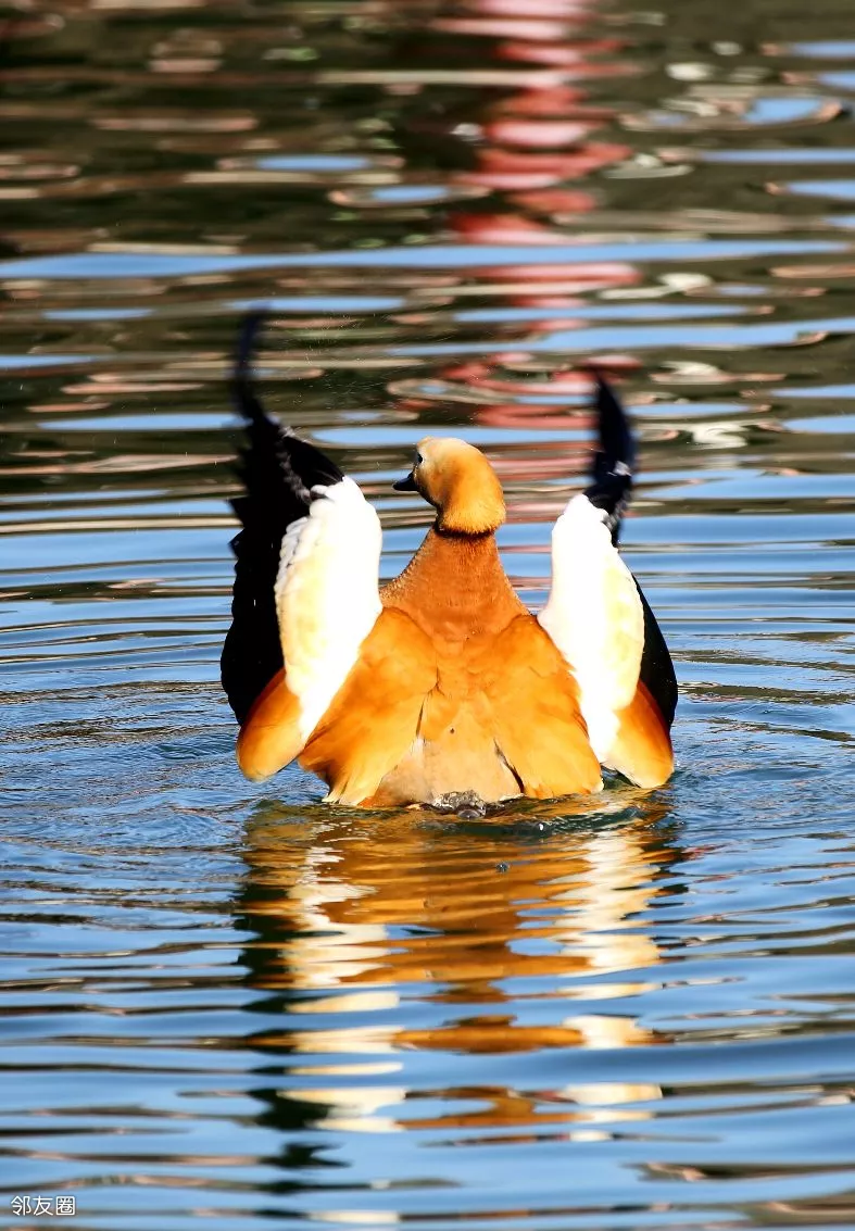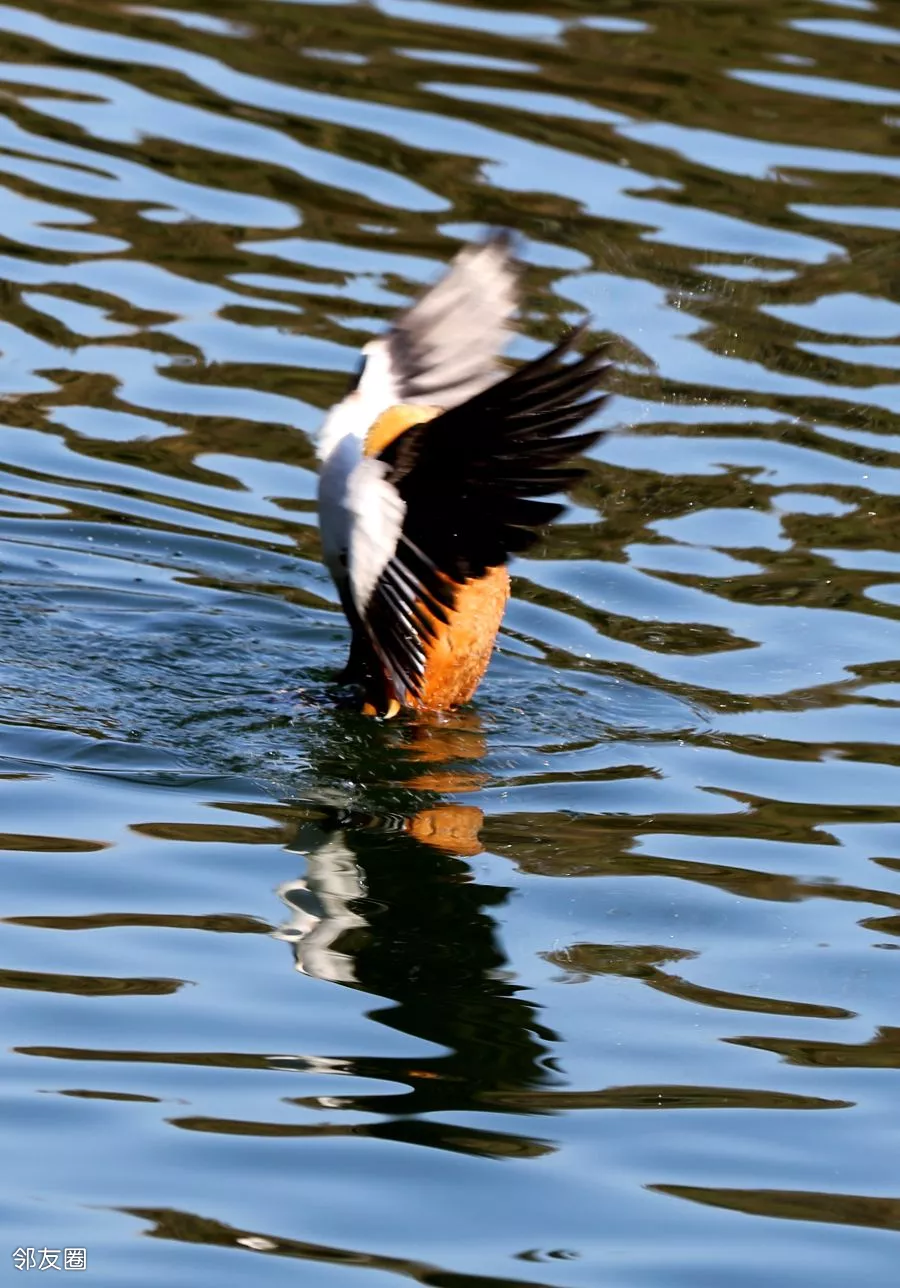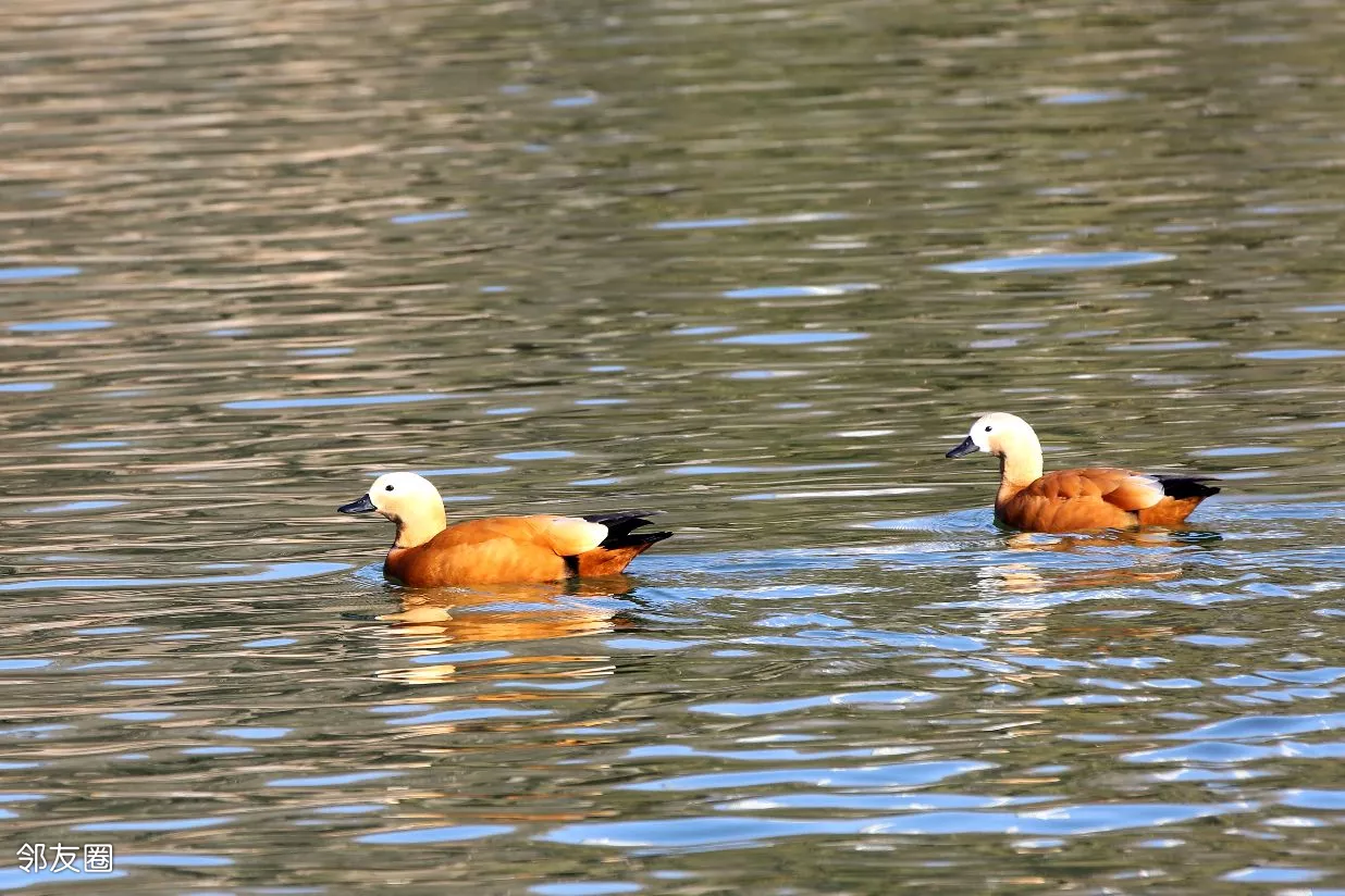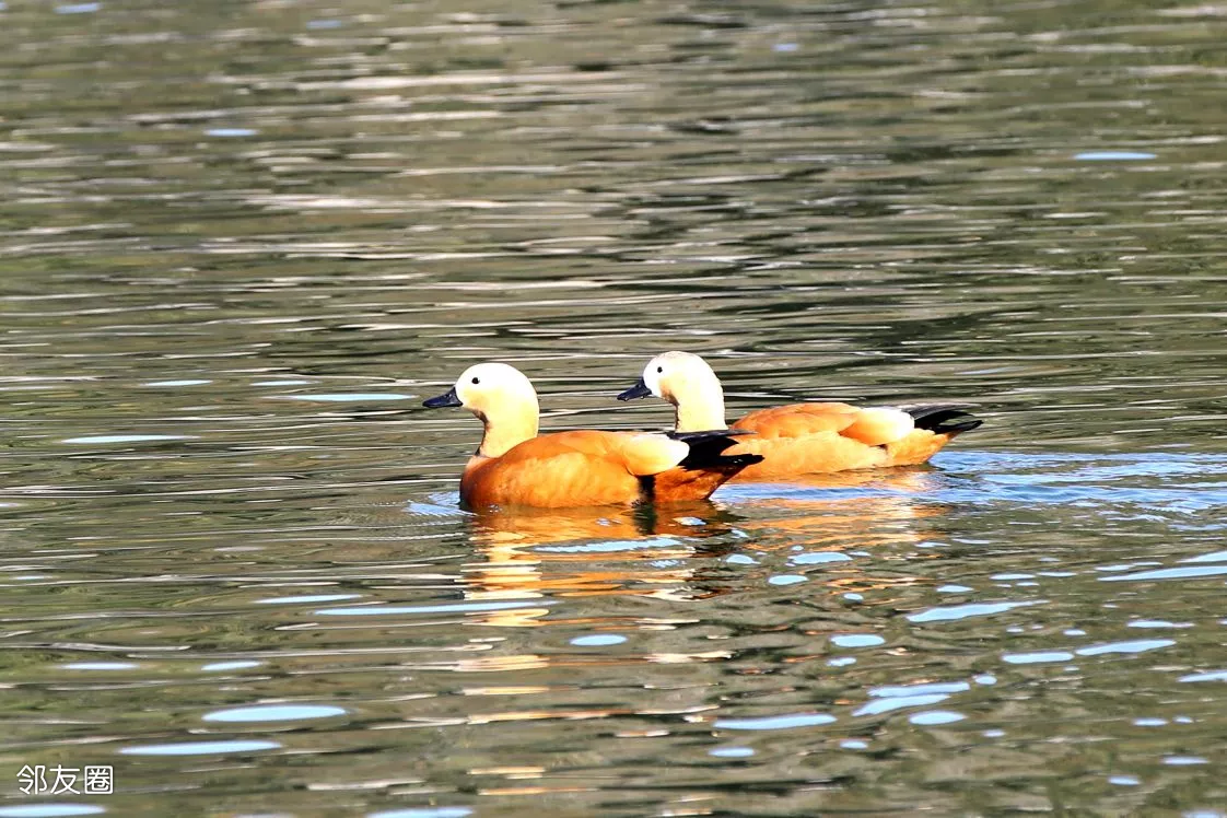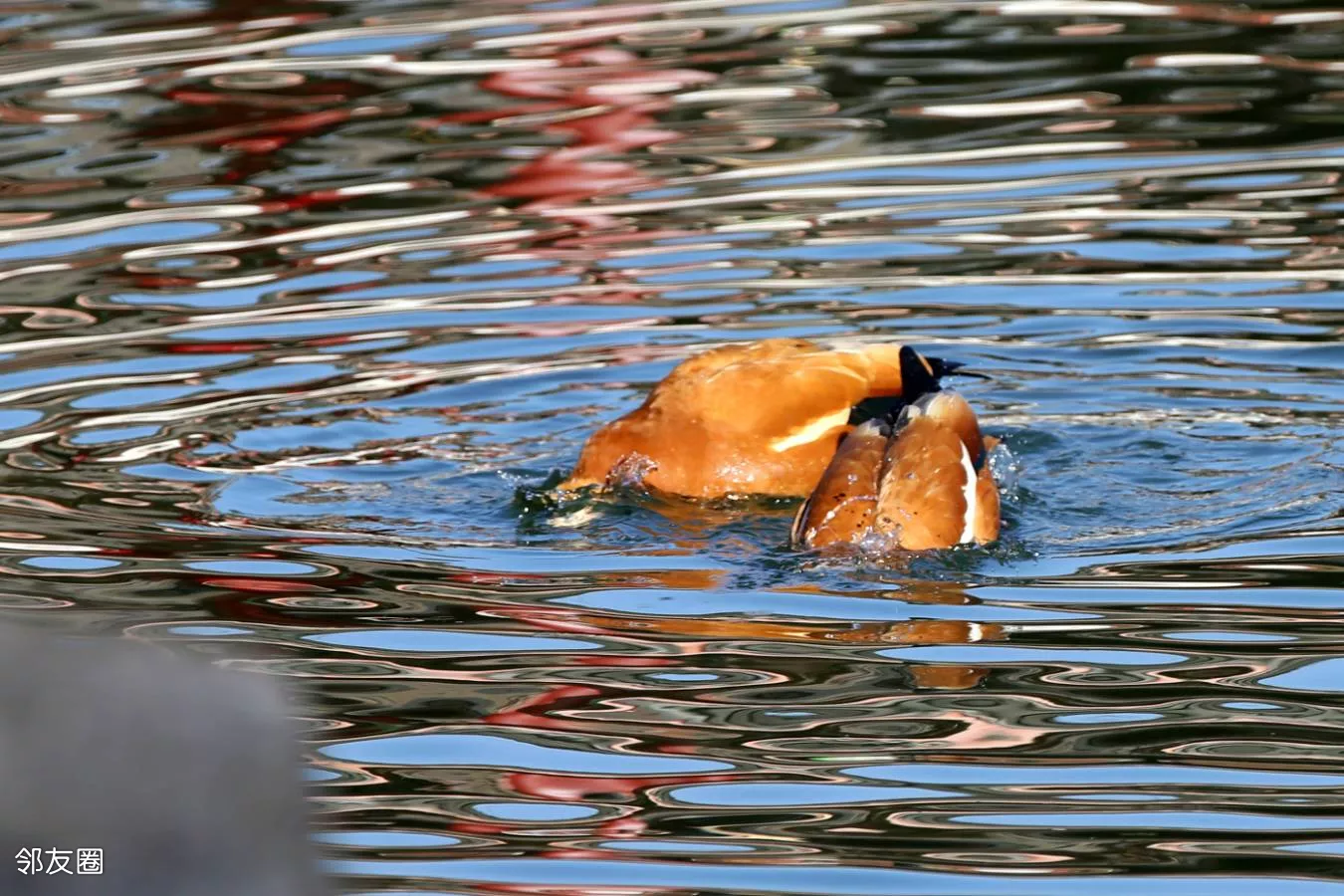 在银白色的冰面和水面上,两夫妻一身靓丽的橙棕色非常抢眼,就像穿着高贵的皮草。小夫妻形影不离,一会儿亲昵地贴贴,一会儿双双潜水觅食,一会儿梳洗打扮,一会儿比翼双飞,时不时地“哦—”“啊—”“哦—”“啊—”地一唱一和,显得非常兴奋,一时成为全池塘的焦点,牢牢地吸引住所有人的目光。