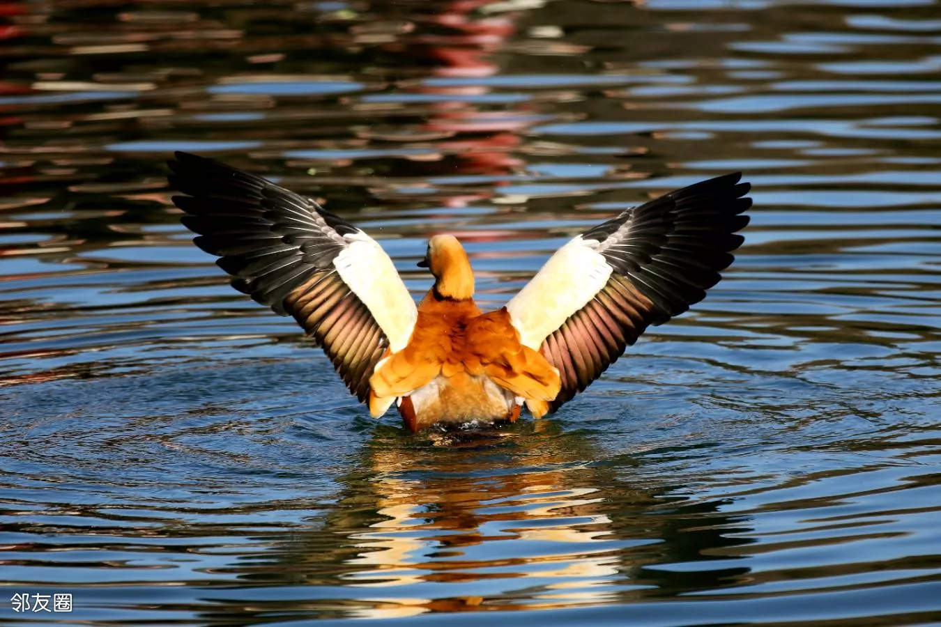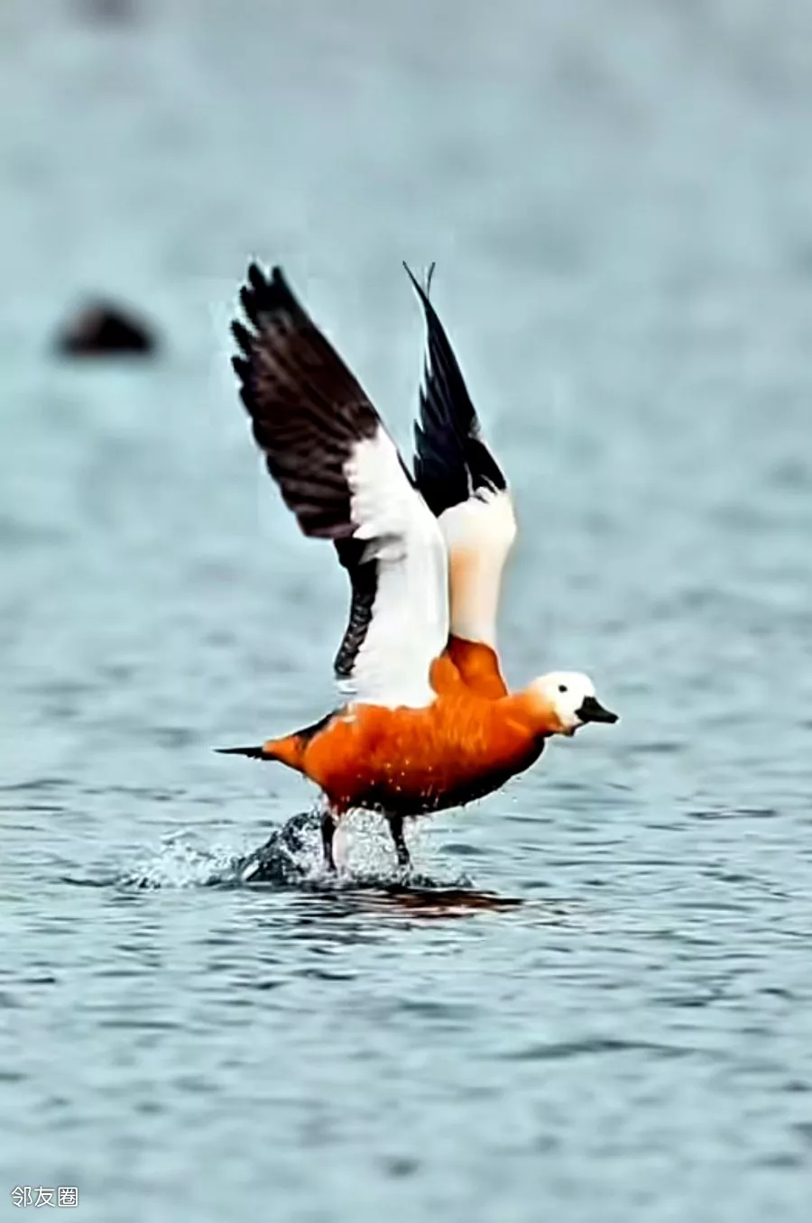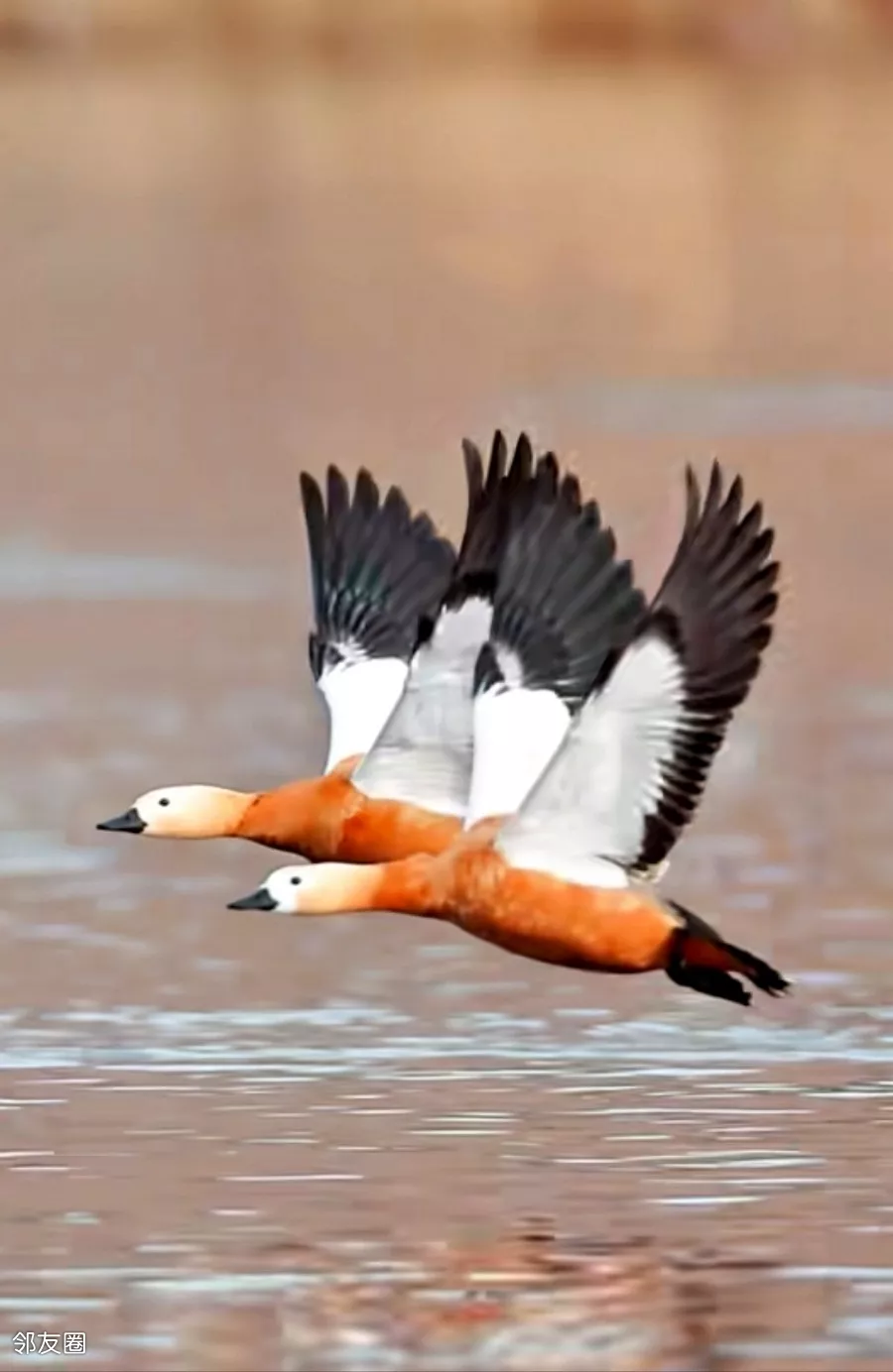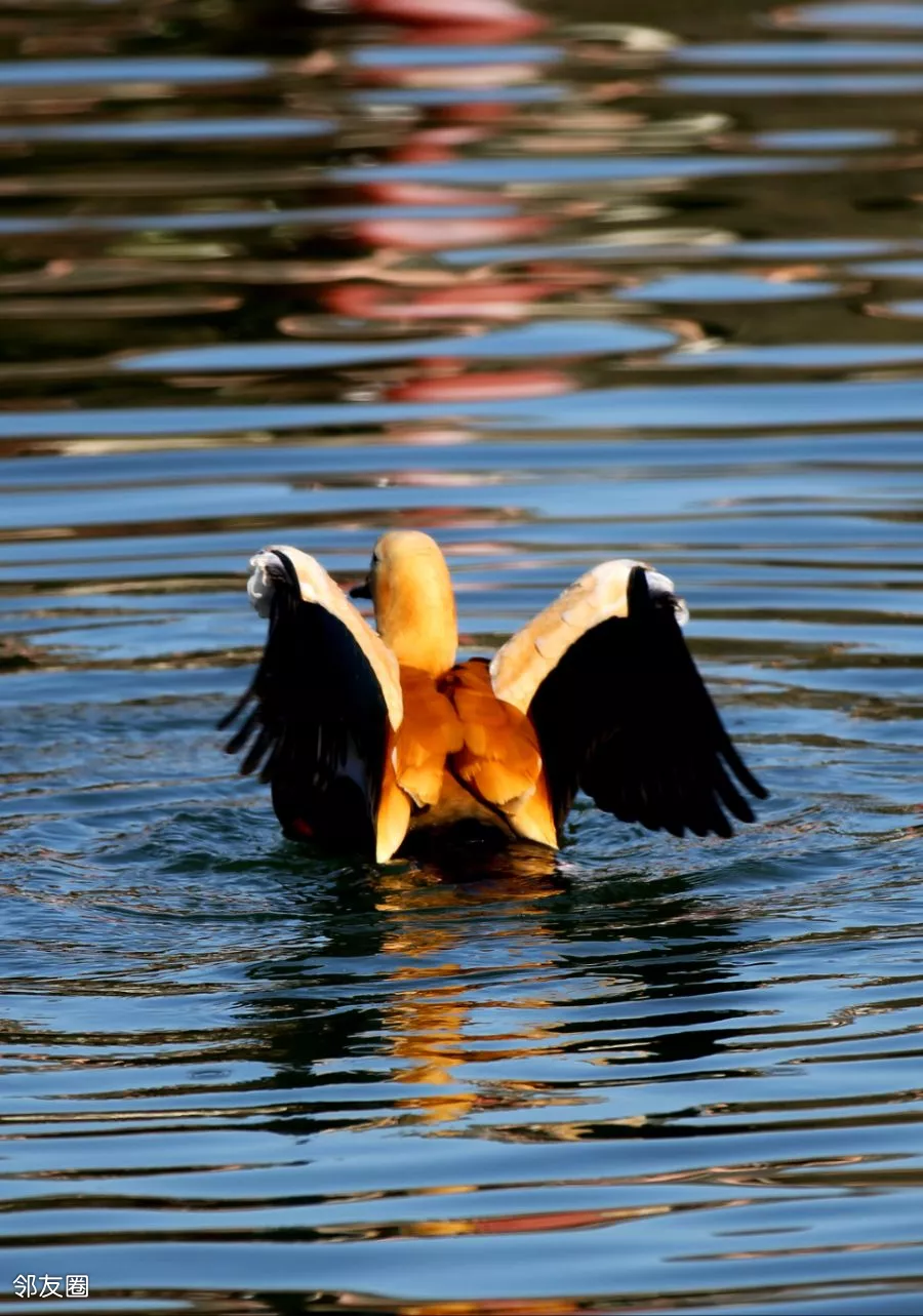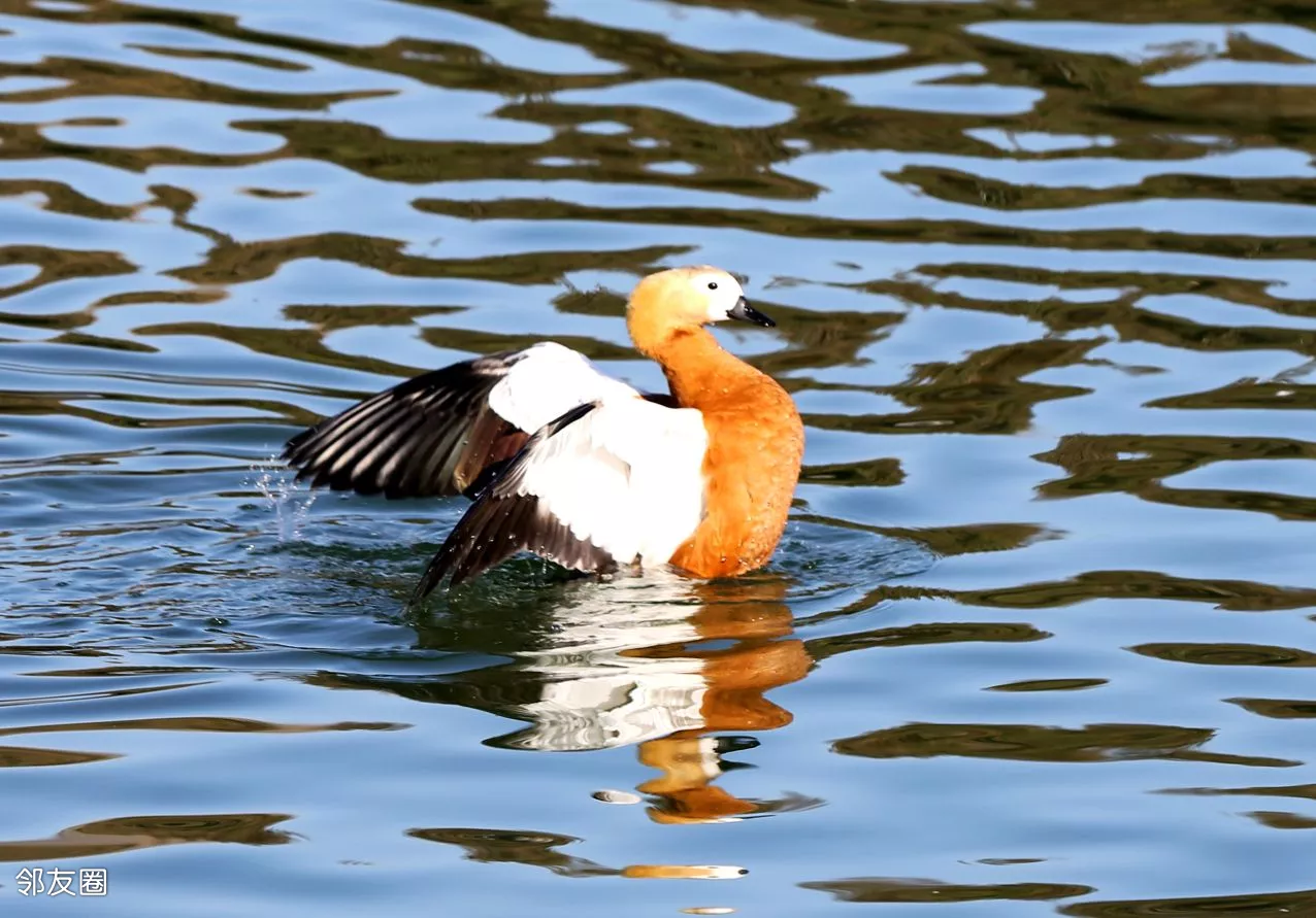 在银白色的冰面和水面上,两夫妻一身靓丽的橙棕色非常抢眼,就像穿着高贵的皮草。小夫妻形影不离,一会儿亲昵地贴贴,一会儿双双潜水觅食,一会儿梳洗打扮,一会儿比翼双飞,时不时地“哦—”“啊—”“哦—”“啊—”地一唱一和,显得非常兴奋,一时成为全池塘的焦点,牢牢地吸引住所有人的目光。