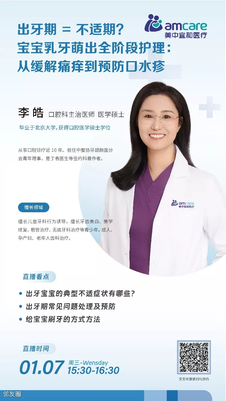 出牙宝宝的典型不适症状有哪些?出牙期有哪些常见问题,如何处理及预防?以及如何正确给宝宝刷牙?1月7日(周三)15:30-16:30有北京宜和医院口腔科李皓医生为您带来宝宝乳牙萌出全阶段护理攻略,欢迎收看~