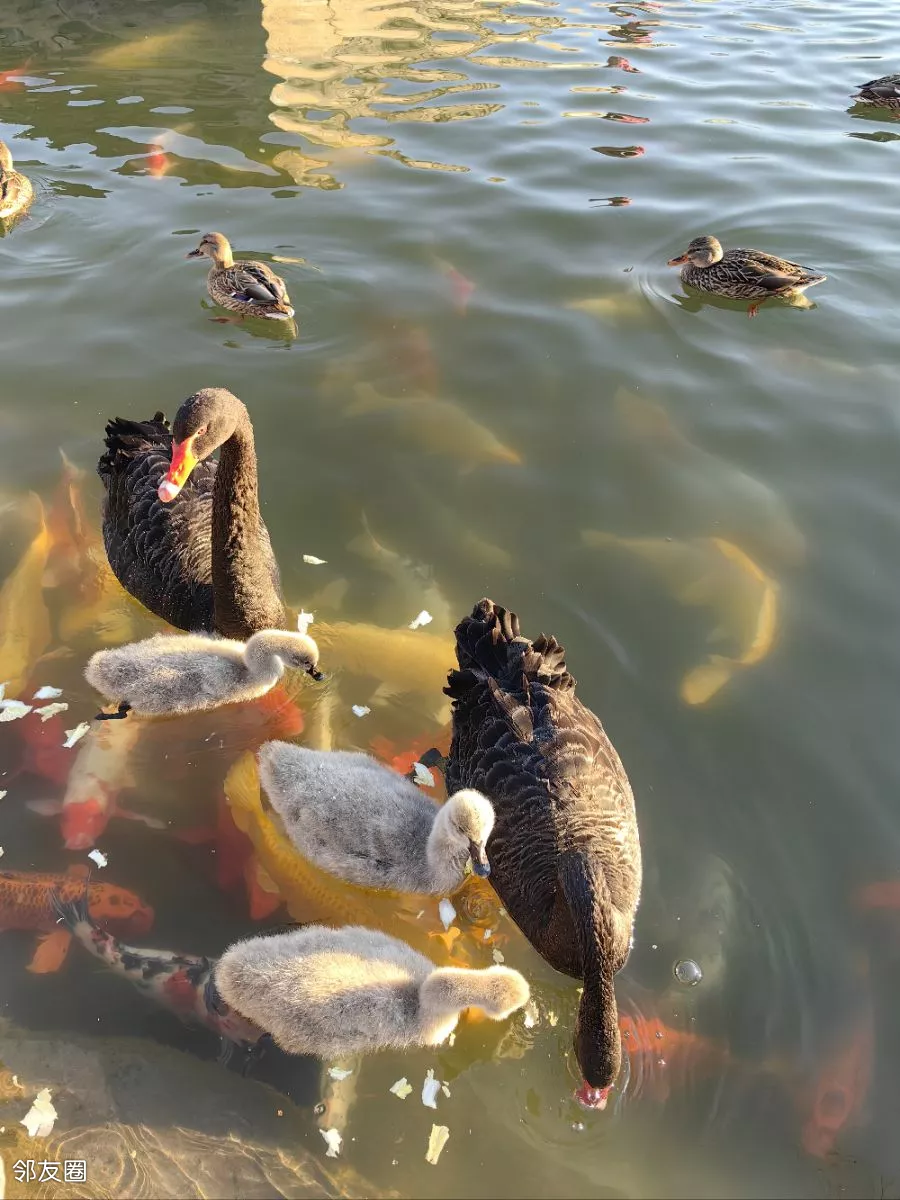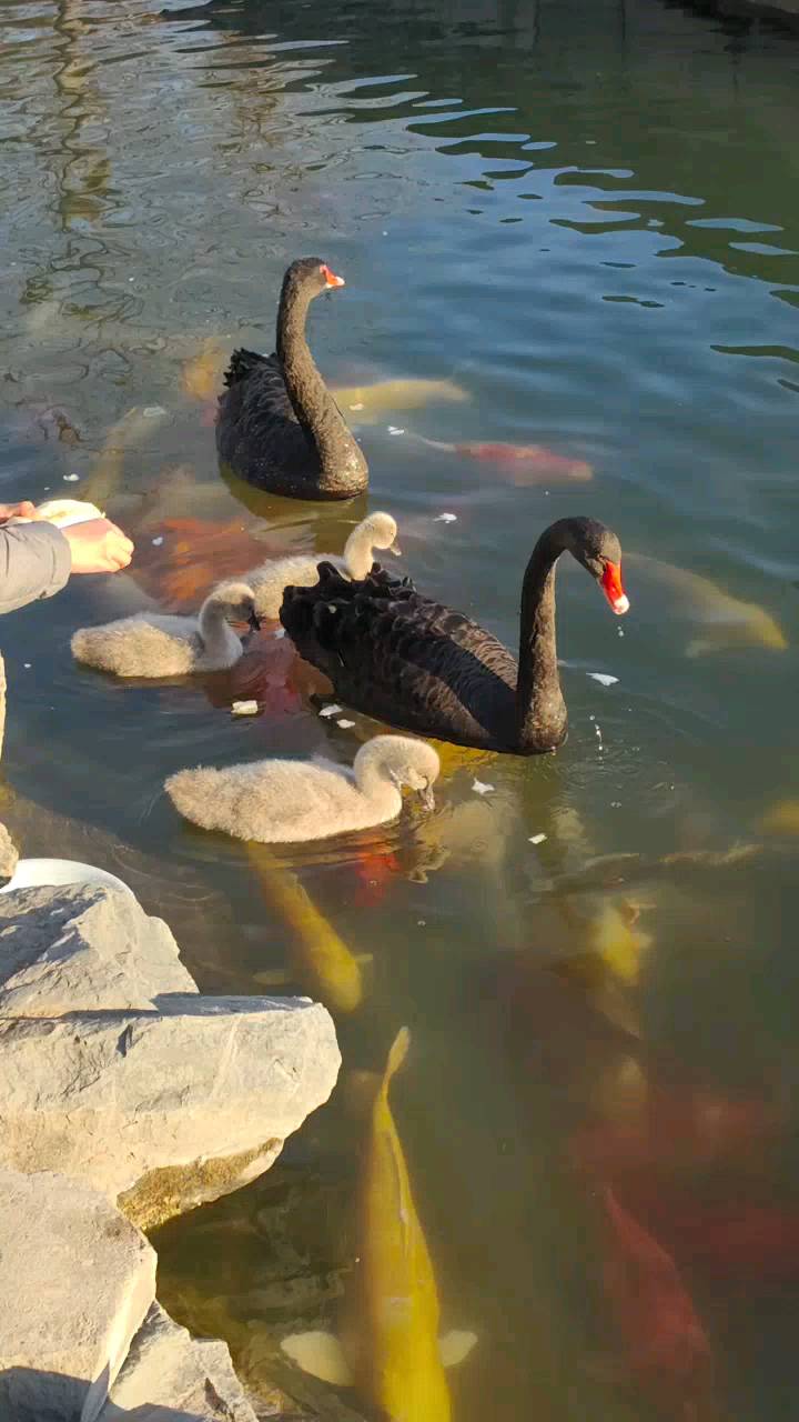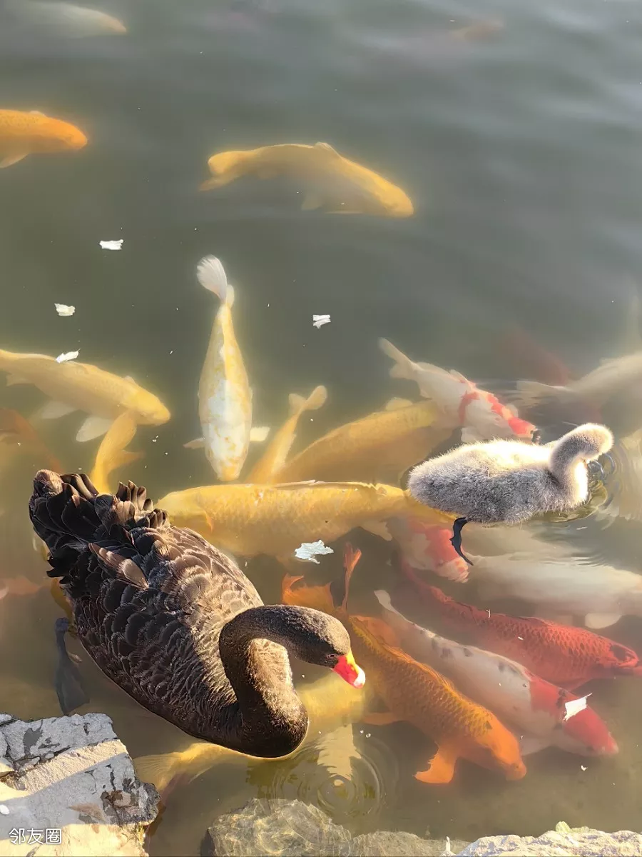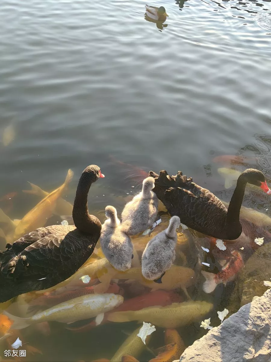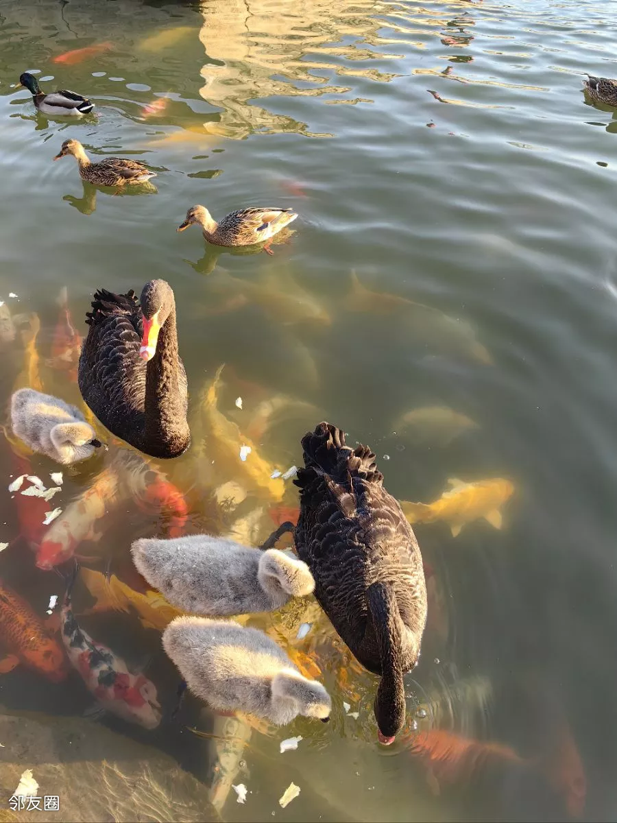 在曲院风荷看完八只小黑天鹅一家,转到万方安和景区,湖里硕大的锦鲤和黑天鹅一家和平相处。