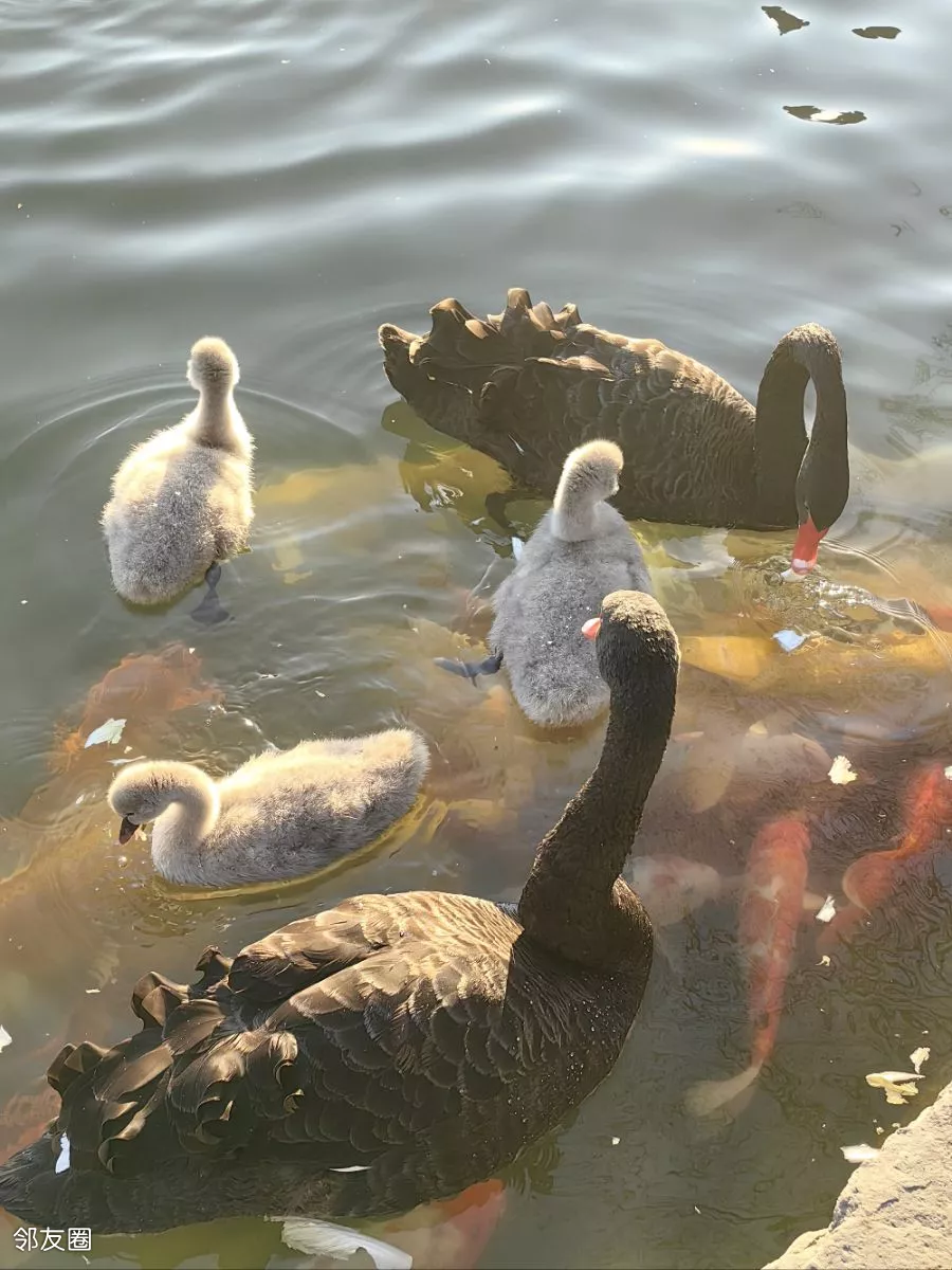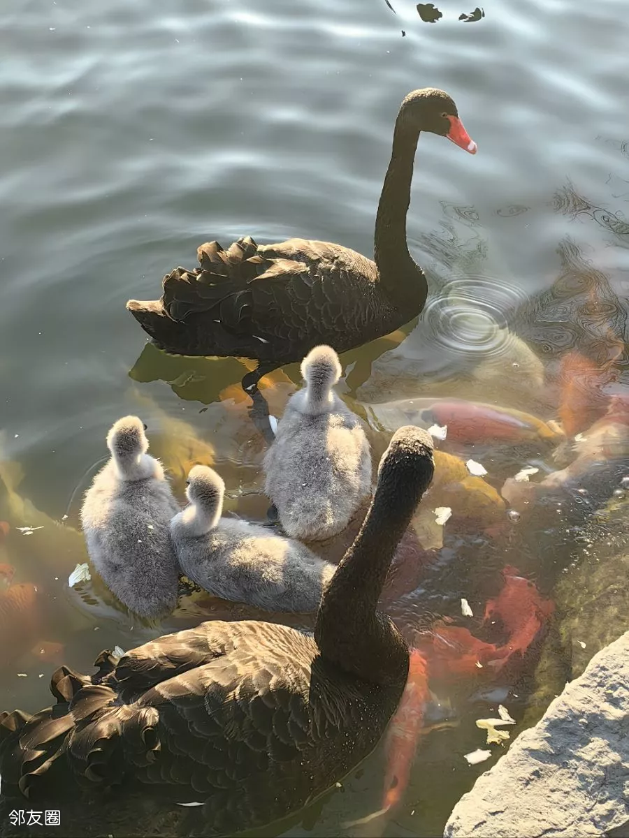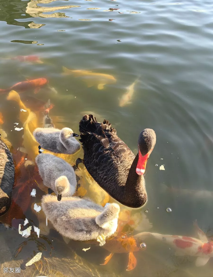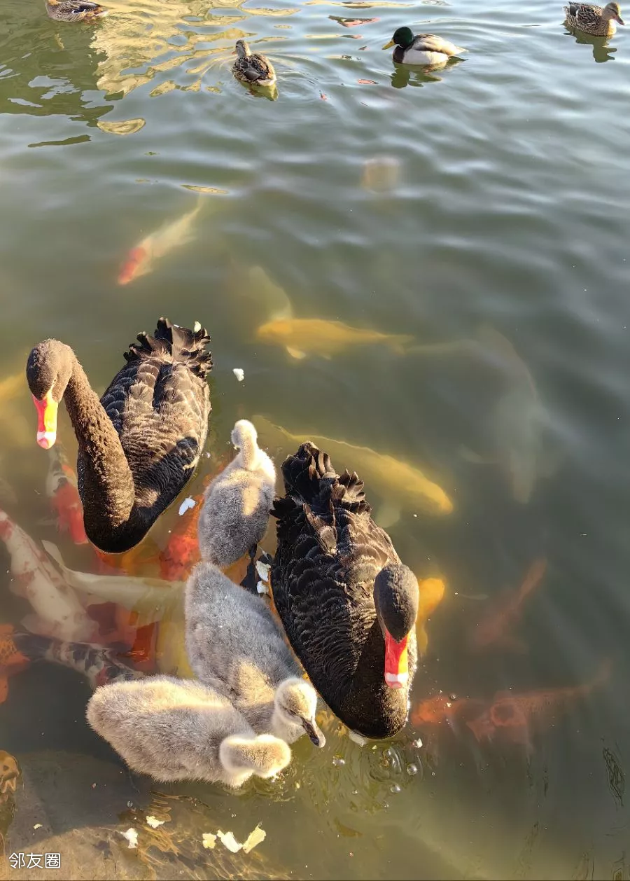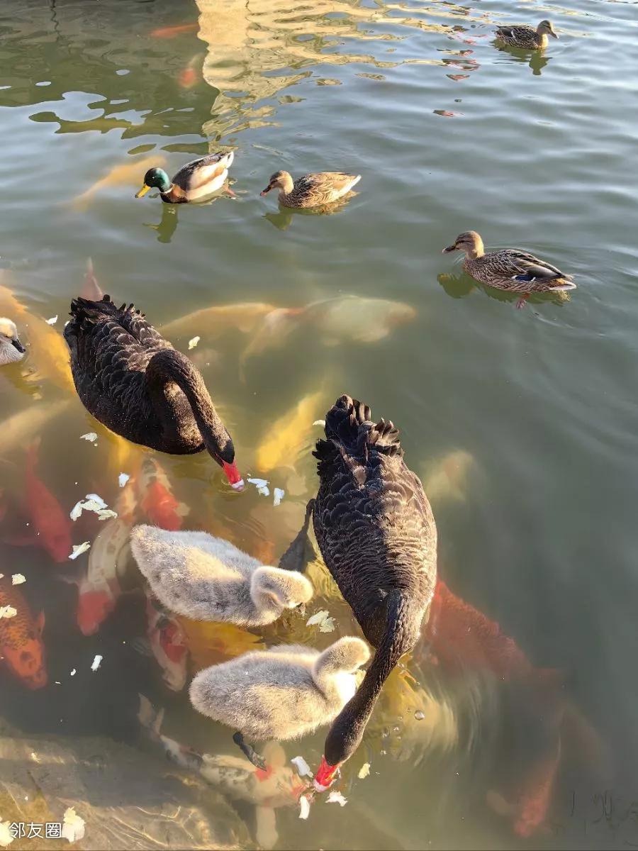 在曲院风荷看完八只小黑天鹅一家,转到万方安和景区,湖里硕大的锦鲤和黑天鹅一家和平相处。