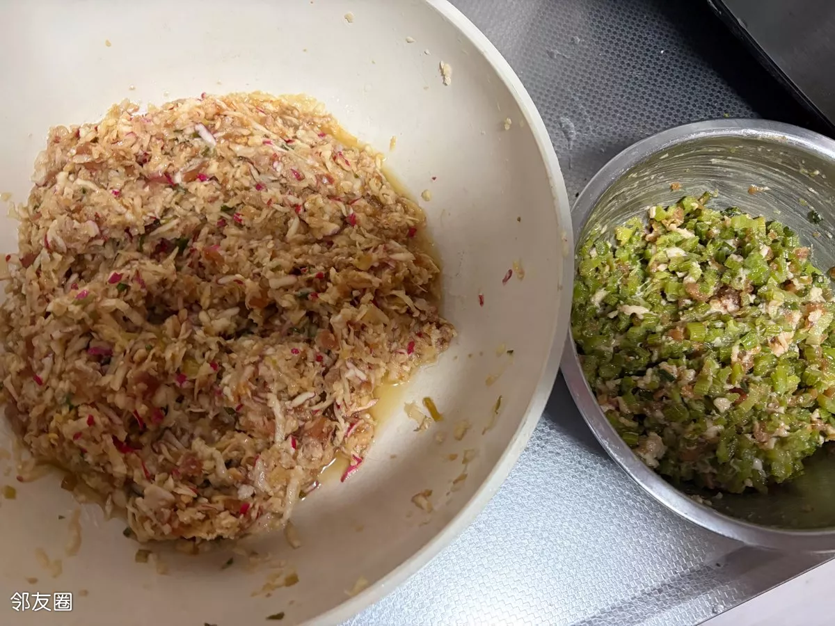 昨天长途今天上午没出去,中午捞豆饭,吃完了又把卞萝卜擦出来,芹菜焯水,肉馅味上!