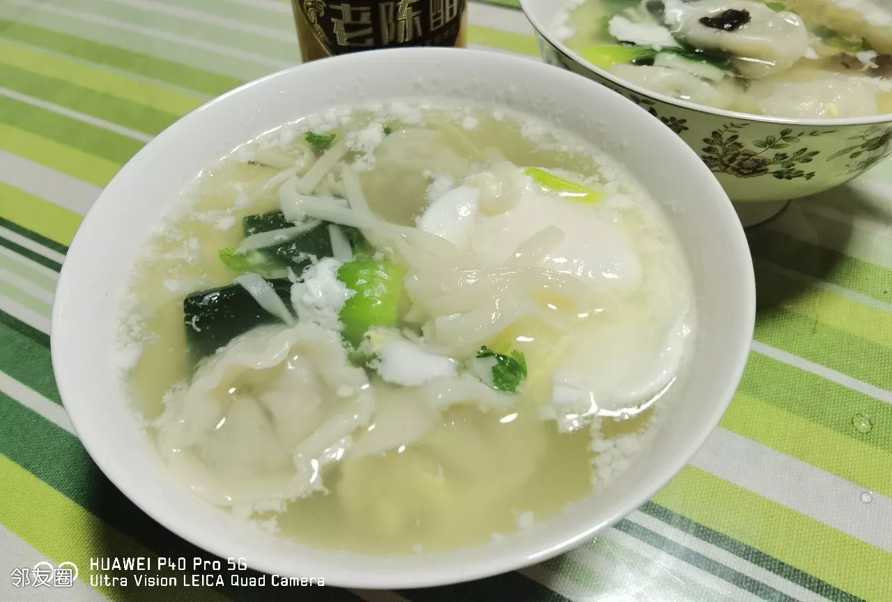 昨天晚上包了二十多个馄饨,今天早餐就吃云吞面。