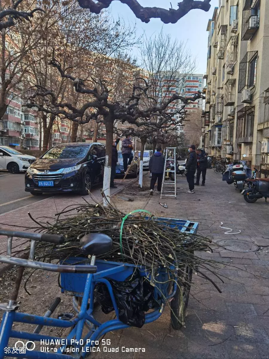 小区里的师傅们在修剪树枝,我对师傅们说:看见你们剪树枝感觉春天快来了。
