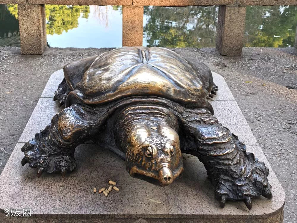 西区以放生池为中心,建有湖心亭、抄经室等建筑。放生池全名“广仁放生池”,池中稀有一景是班鼋。此鼋头部分布黄色斑点,巨若餐桌,属国家一级珍稀濒危物种。明代建园时曾投放其中,至今已逾四百余岁,人称“神鼋”。温舒时节,巨鼋偶出水面,游人香客皆以见之为吉兆。