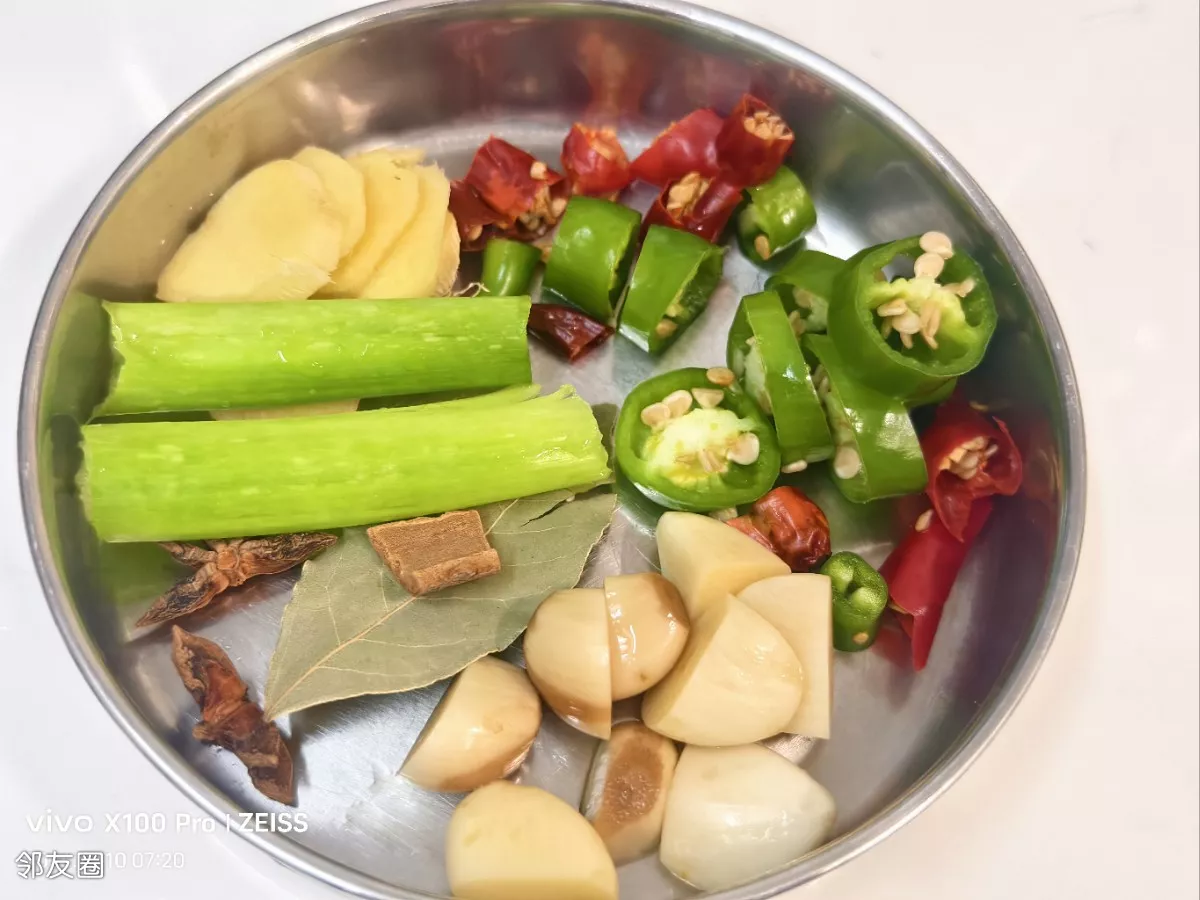 洗净焯水沥干水分,准备小料,葱姜蒜八角桂皮香叶干辣椒青红椒!