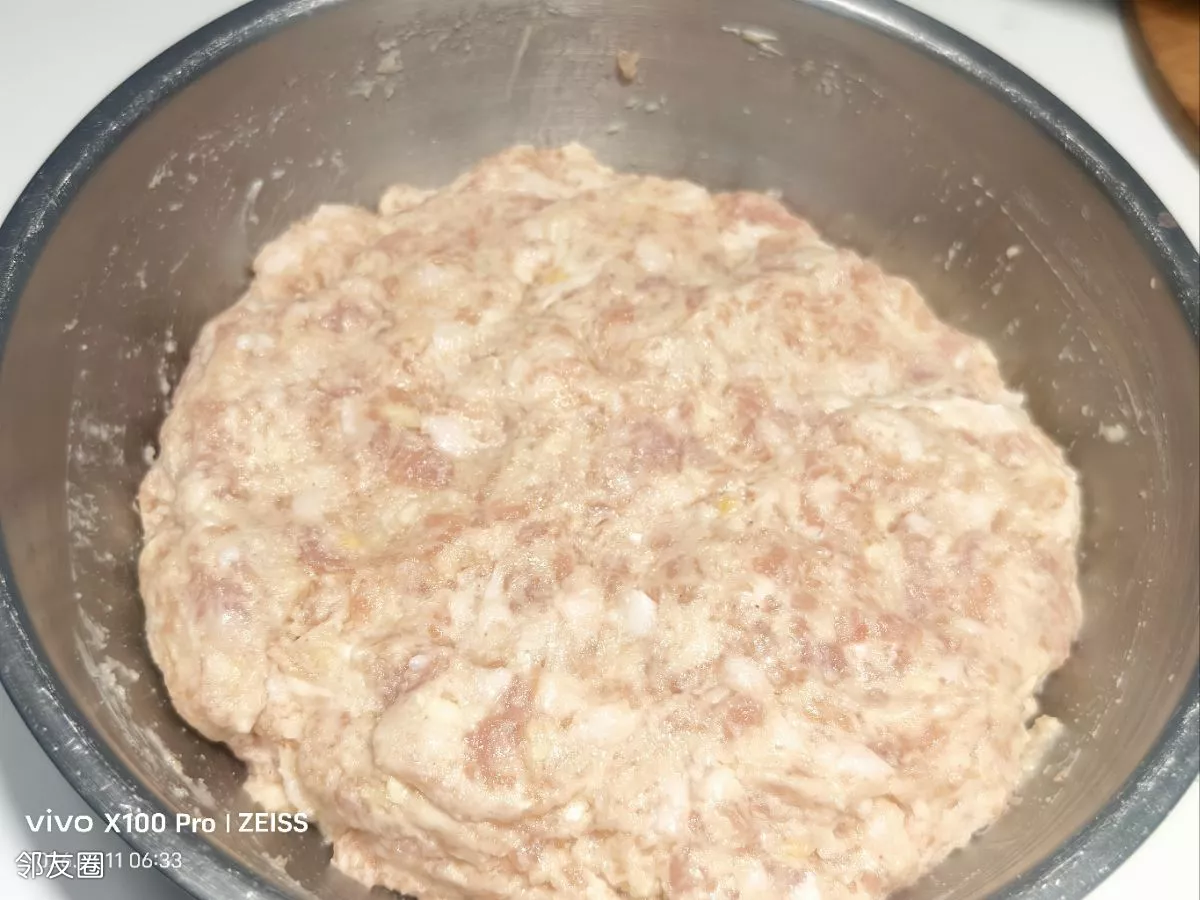 肉馅里加葱花椒水后搅拌至粘手状态,淀粉调制成酸奶状态,把其它所有调味料放进去继续和面式搅拌至融合!
