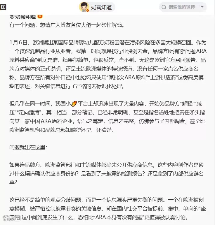 1月6日,欧洲曝出某国际品牌*巢的婴幼儿配方奶粉因潜在污染风险在多国大规模召回,服用会对婴幼儿造成严重伤害。在欧洲国家的官网主页就是召回信息,如奥地利,比利时,克罗地亚,荷兰,德国,塞尔维亚,挪威,俄罗斯,英国。这一点是值得肯定的。