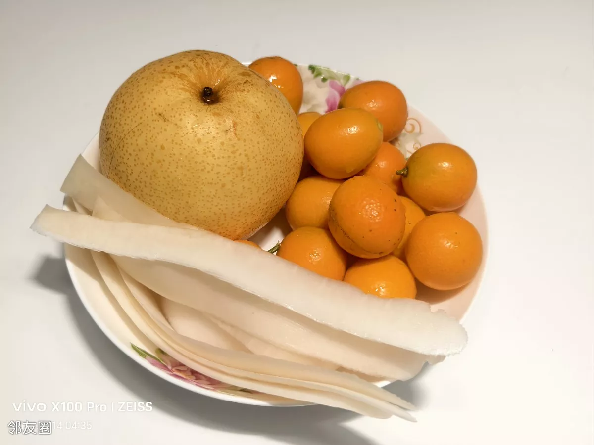 白萝卜皮,金桔,雪梨,放一点冰糖一起煮水喝!