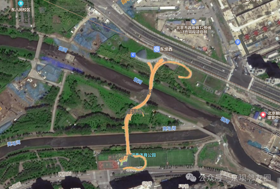 东坝西站跨河接驳慢行桥南起坝河南路,北端直接连12号线东坝西站C口,要上跨坝河、亮马河还有两河交汇的洲岛,南端通到亮马河南岸的东坝南区,全长足足有585米,相当于直接在两条河上搭了条“慢行捷径”。