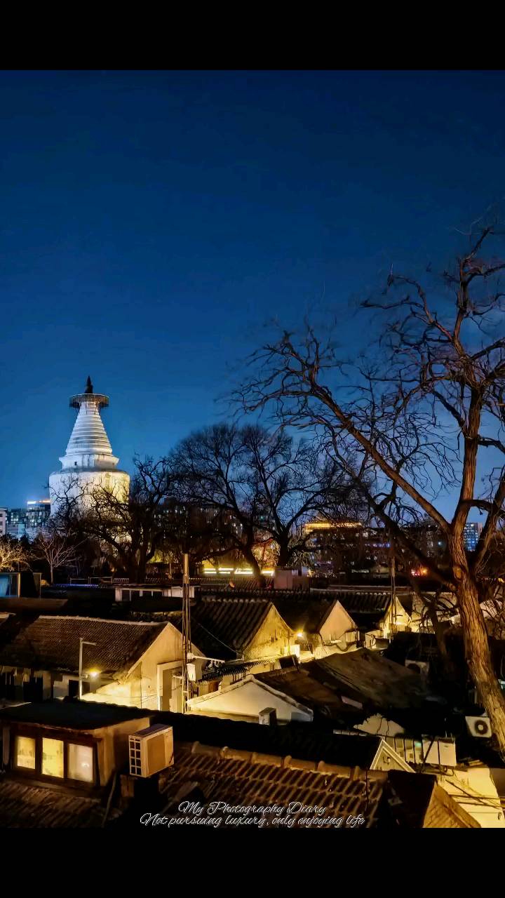 夜色里的白塔,在胡同屋脊旁站成了岁月的坐标,树影摇落间,是老北京的温柔。