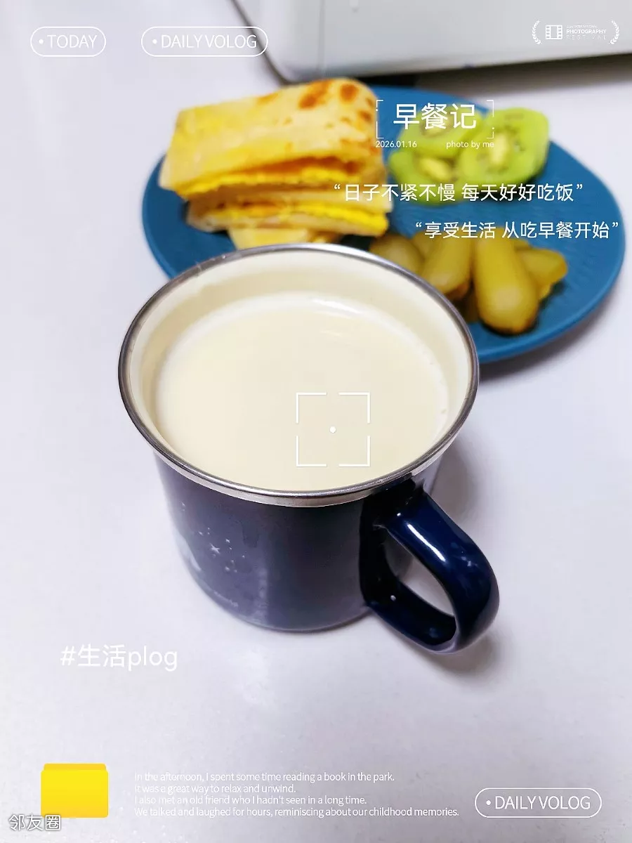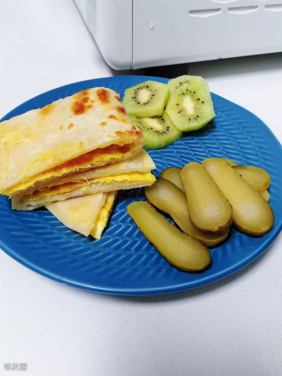 手抓饼,热豆浆,酸黄瓜,猕猴桃