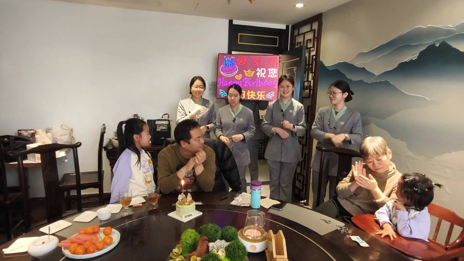 外孙女在某饭店过生日,就餐结束后饭店服务员为她唱了一首祝福生日的歌曲,真是意外的惊喜!
