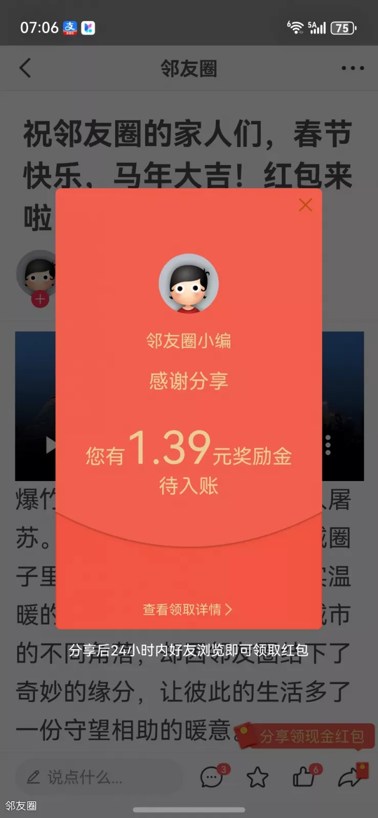 祝邻友圈的家人们,春节快乐,马年大吉!红包来啦!