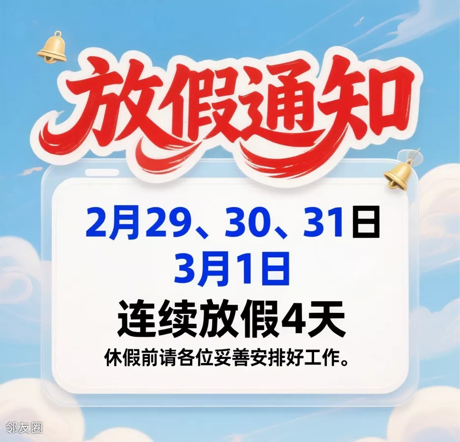 刚放完春节八天假期,没上几天班,这又来了新的五天放假通知:2月28、29、30、31日,3月1日连续放假5天,休假前请各位妥善安排好工作。