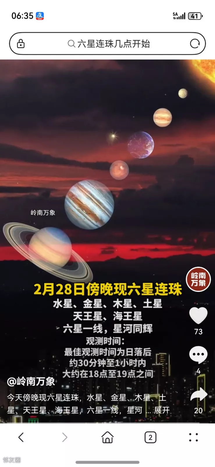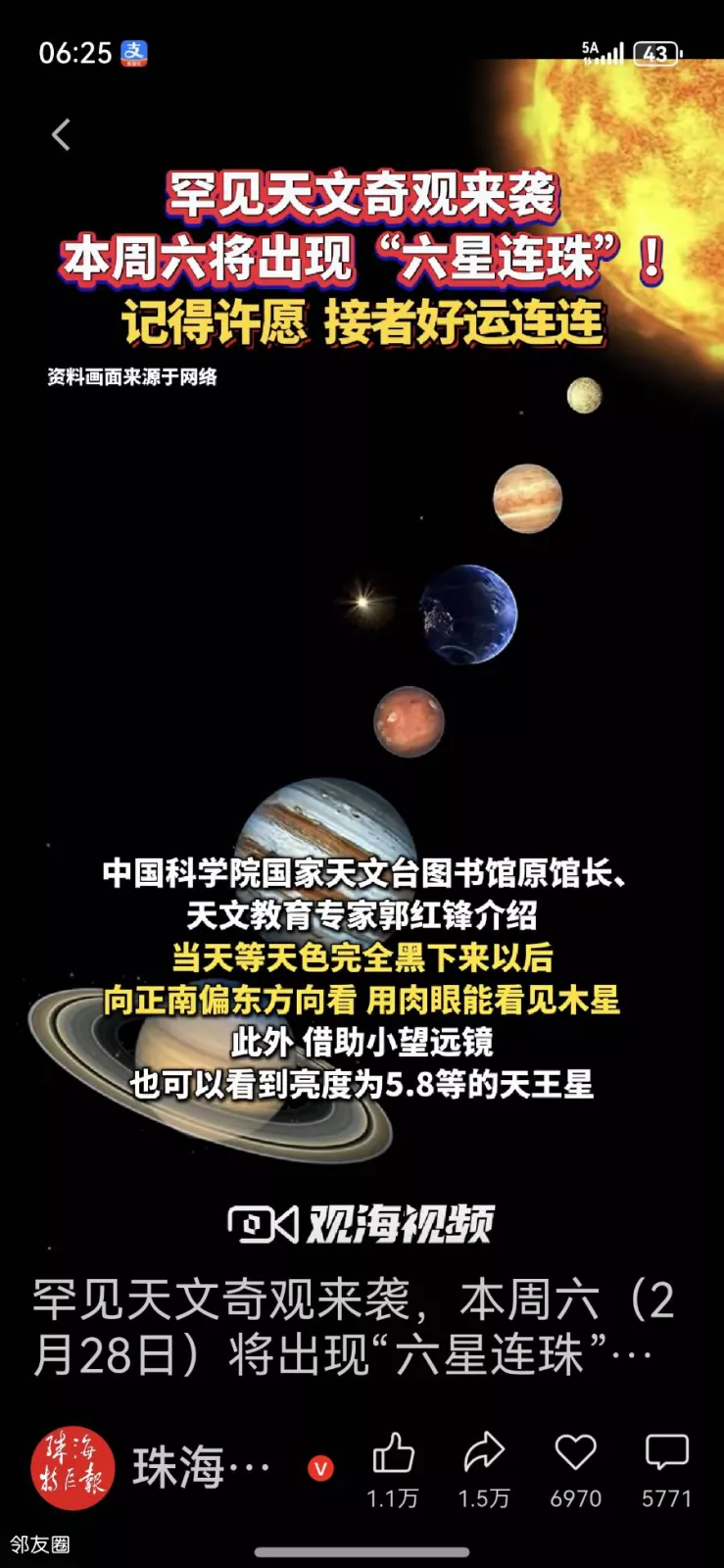 今天(2月28日)傍晚迎来了六星连珠天象。水星、金星、木星、土星、天王星、海王星。