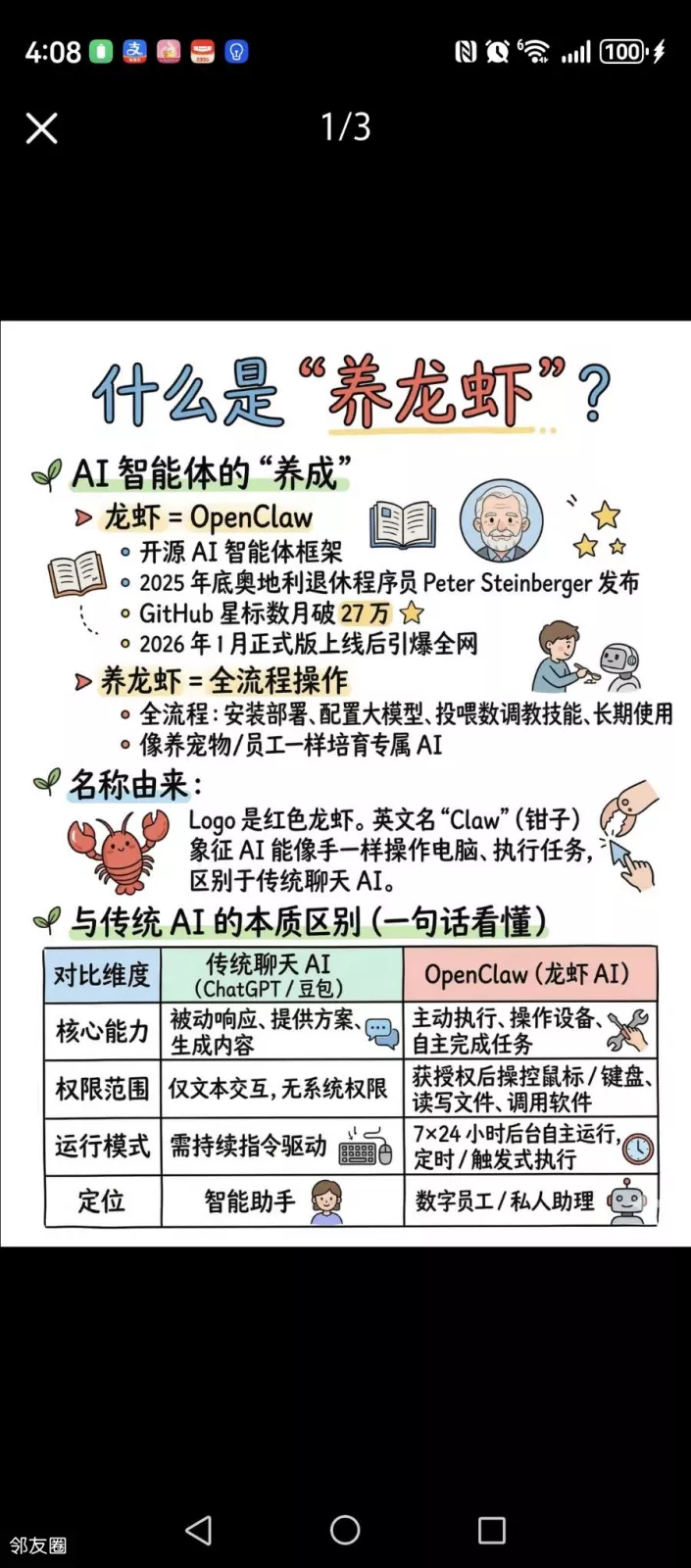 养龙虾” 是 2026 年初爆火的 AI 圈热梗,指部署、训练与使用开源 AI 智能体OpenClaw。它因 Logo 是红色龙虾、英文名 Claw(钳子)得名,寓意 AI 从 “动口” 变 “动手”。