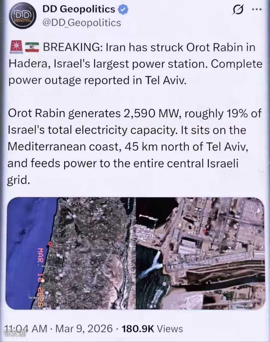 当地时间3月9日,伊朗精准打击了奥罗特·拉宾发电站——这座装机容量2590兆瓦、扛着以色列19%发电量的“电力大佬”,瞬间让特拉维夫从霓虹璀璨的现代都市,变成了伸手不见五指的“黑暗之城” 。