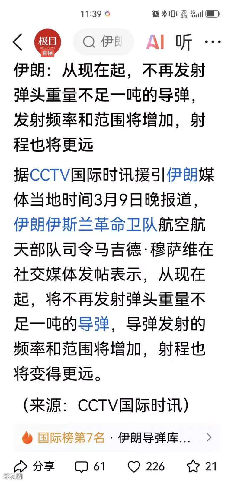 伊朗伊斯兰革命卫队航空航天部队司令马吉德·穆萨维在社交媒体发帖表示,从现在起,将不再发射弹头重量不足一吨的导弹,导弹发射