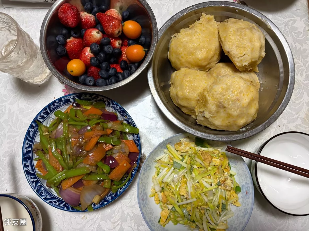 大萝卜馅菜团子➕韭菜、茴香馅烀饼➕炒菜