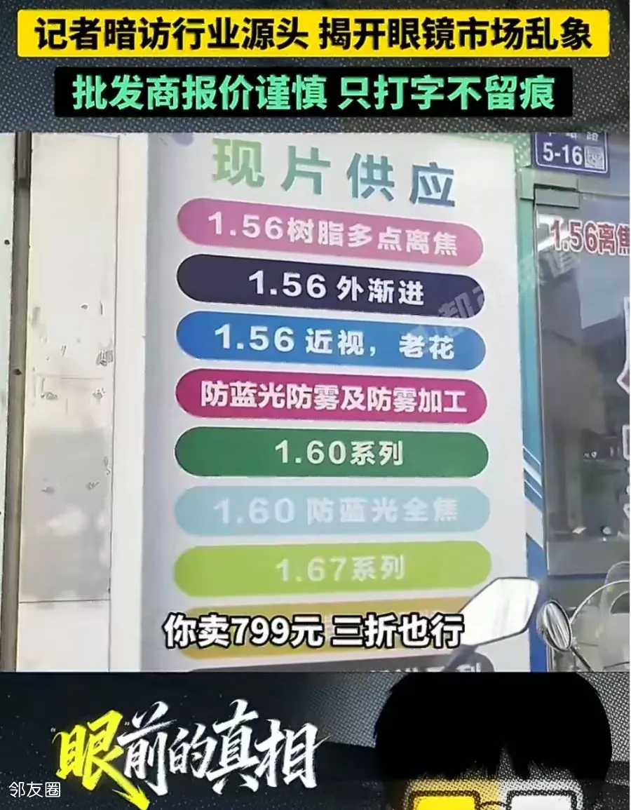 3月14日,江苏。一副眼镜的利润究竟有多惊人?记者近日深入眼镜市场调查。在亚洲最大的眼镜产品集散地,被誉为 “中国眼镜之都”的丹阳,记者发现个别商家聊到拿货价格时十分谨慎,只敢在手机上打字悄悄透露,生怕“隔墙有耳”。商家告诉记者,一款市面上常见的1.61折射率镜片,进货价仅15元,而报价本标价却高达799元,溢价高达53倍!拿货后,即便打出诱人的“3折大促”售卖,仍能卖到240元左右,依然藏着16倍的暴利,行业水分大到惊人。