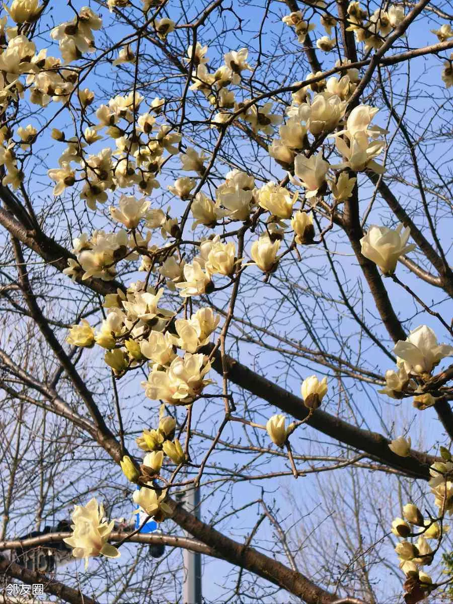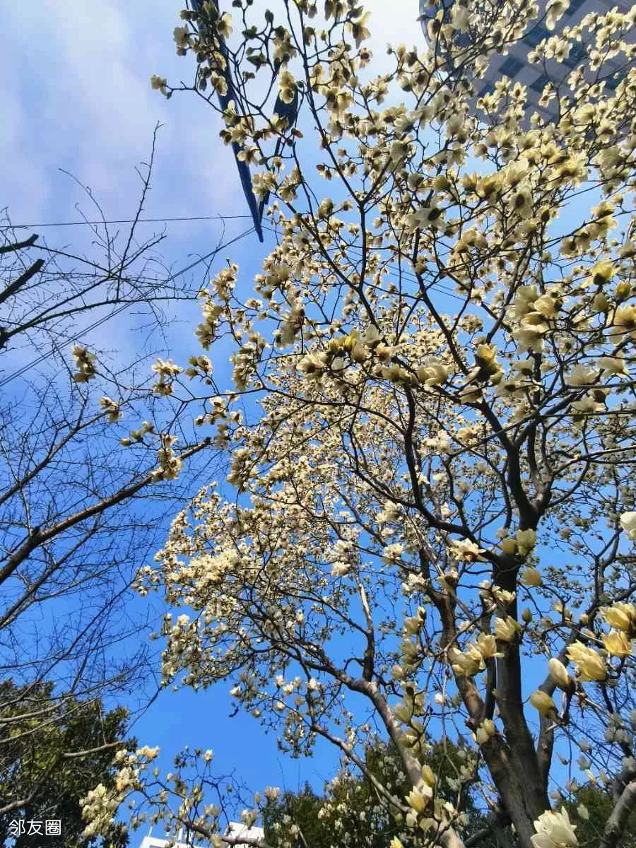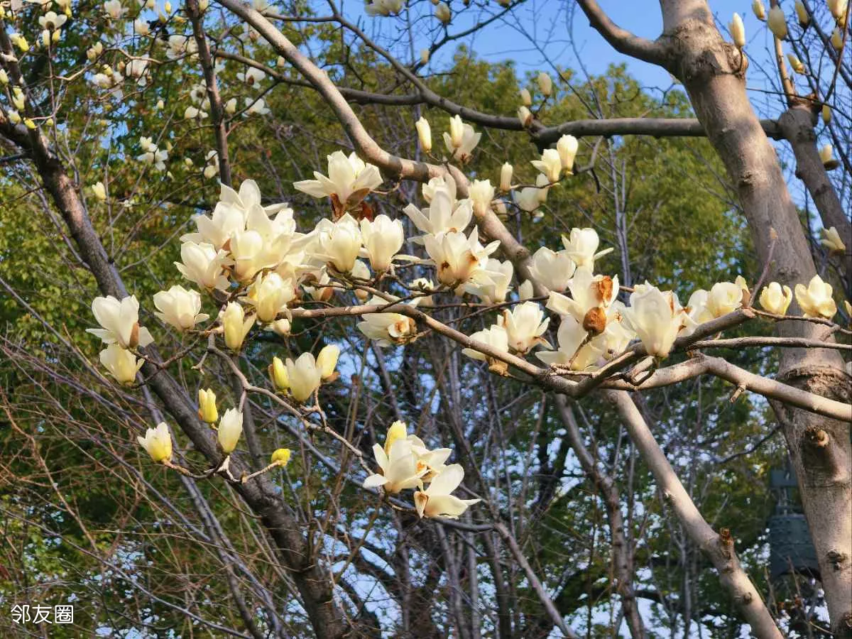 玉兰终于迎来了最盛大的怒放时节。没有绿叶的衬托,花朵却开得干净利落,大气又从容。
