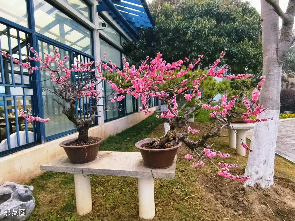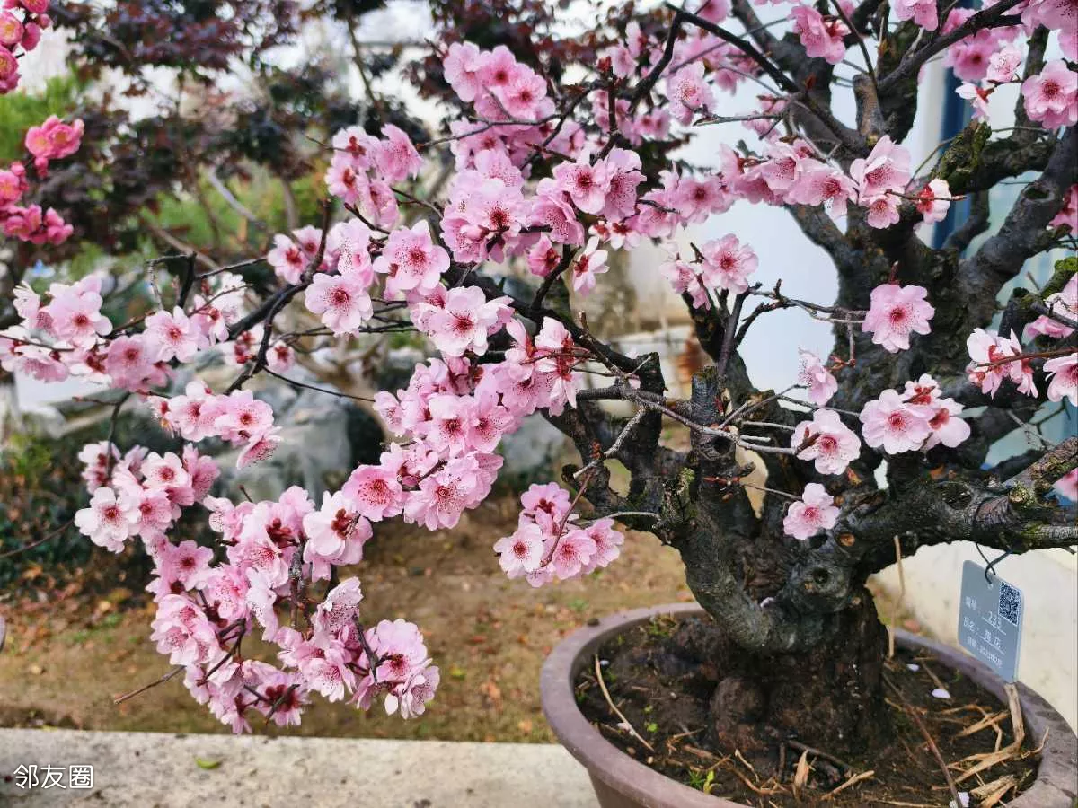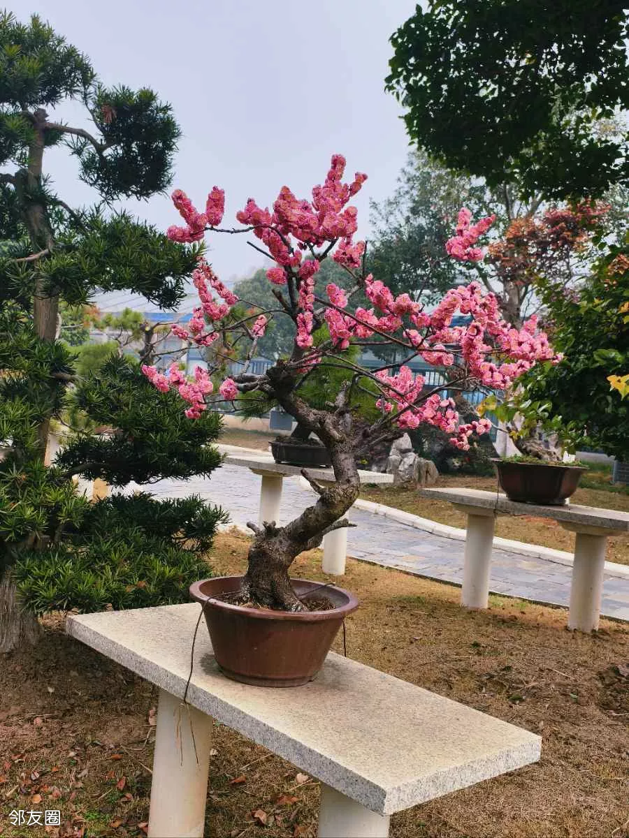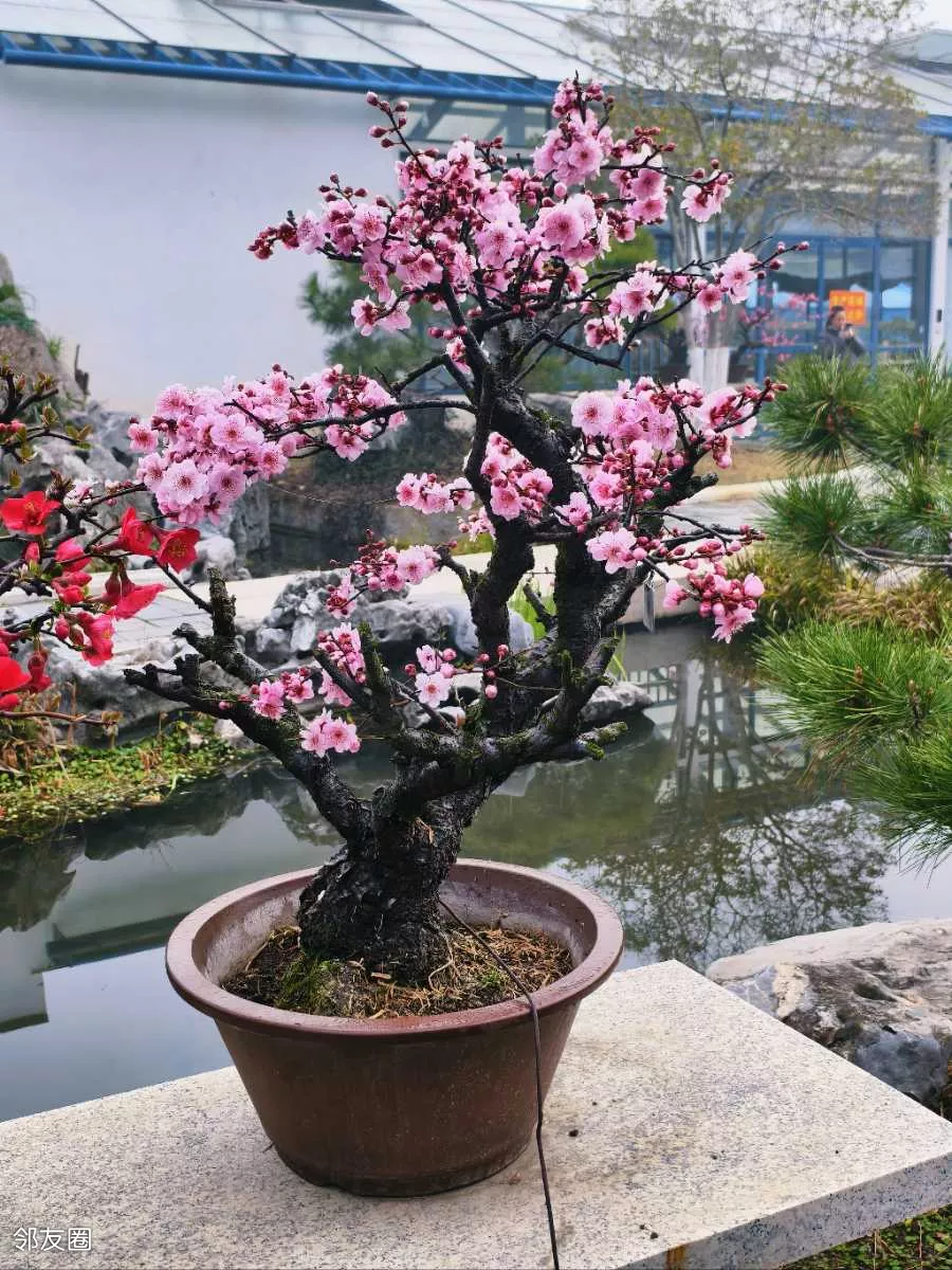 看一眼便是惊艳,几盆梅花盆景,美得大气又精致。站在跟前,忍不住绕着它慢慢转,从左看,姿态万千;从右看,沁人心脾;从上往下看,仿佛藏着岁月韵味;从近往远看,如画如诗,越品越有味道。