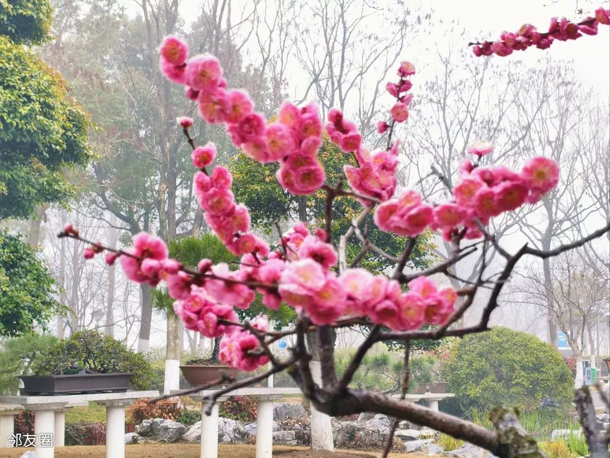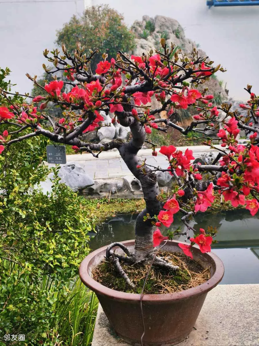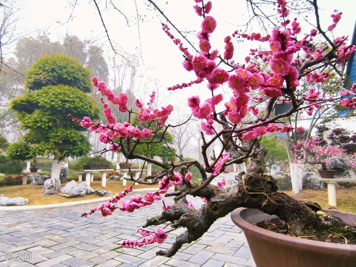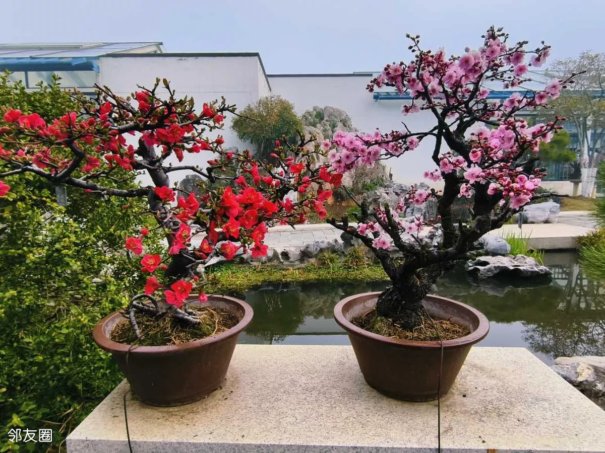 看一眼便是惊艳,几盆梅花盆景,美得大气又精致。站在跟前,忍不住绕着它慢慢转,从左看,姿态万千;从右看,沁人心脾;从上往下看,仿佛藏着岁月韵味;从近往远看,如画如诗,越品越有味道。