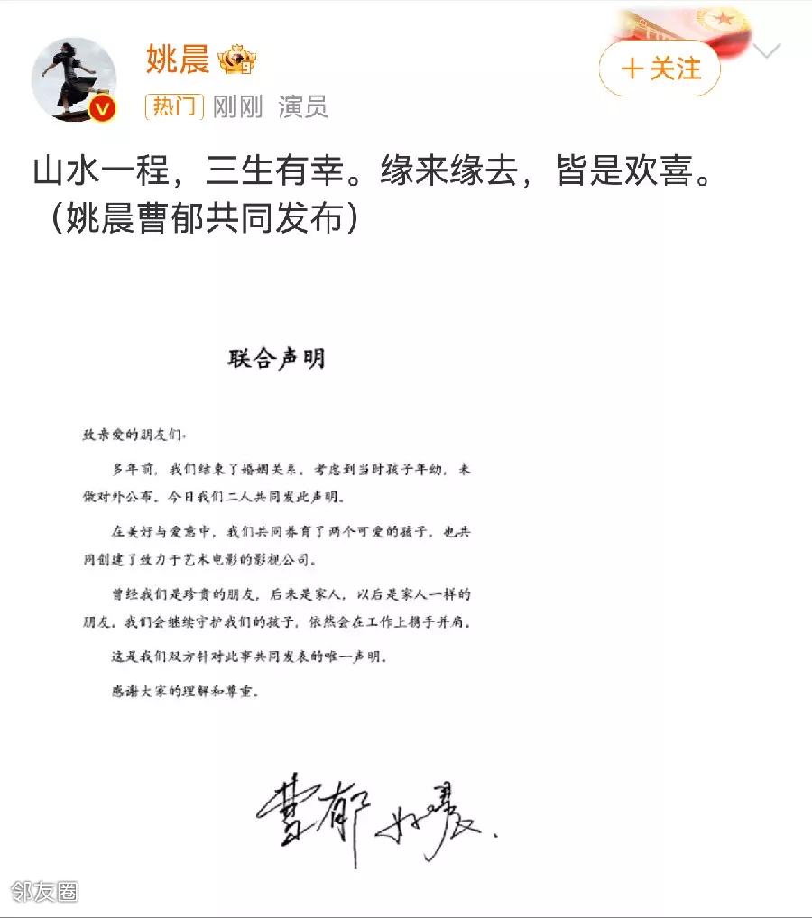 大瓜!姚晨宣布离婚