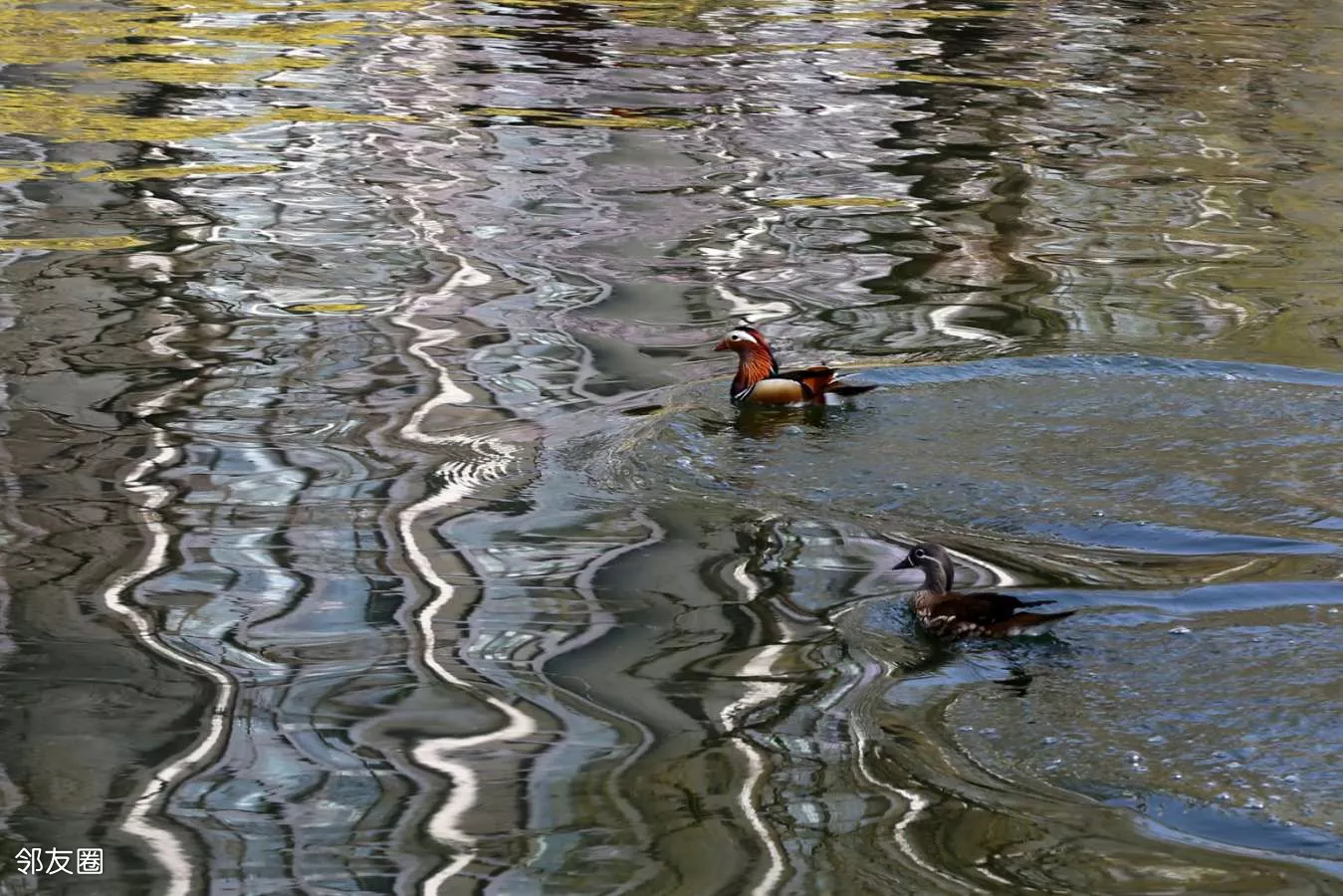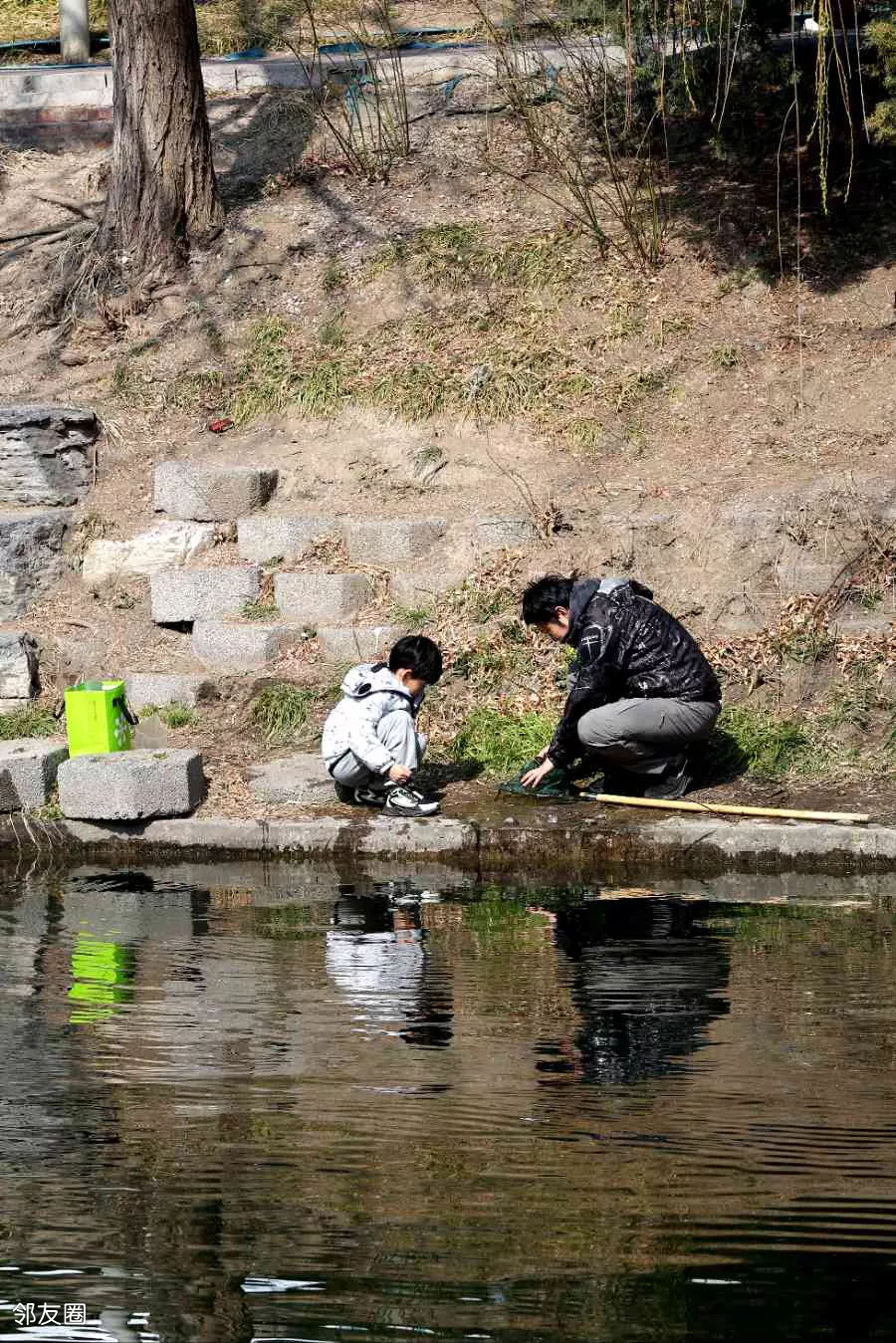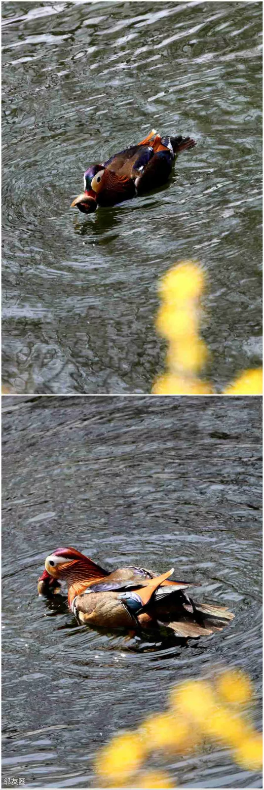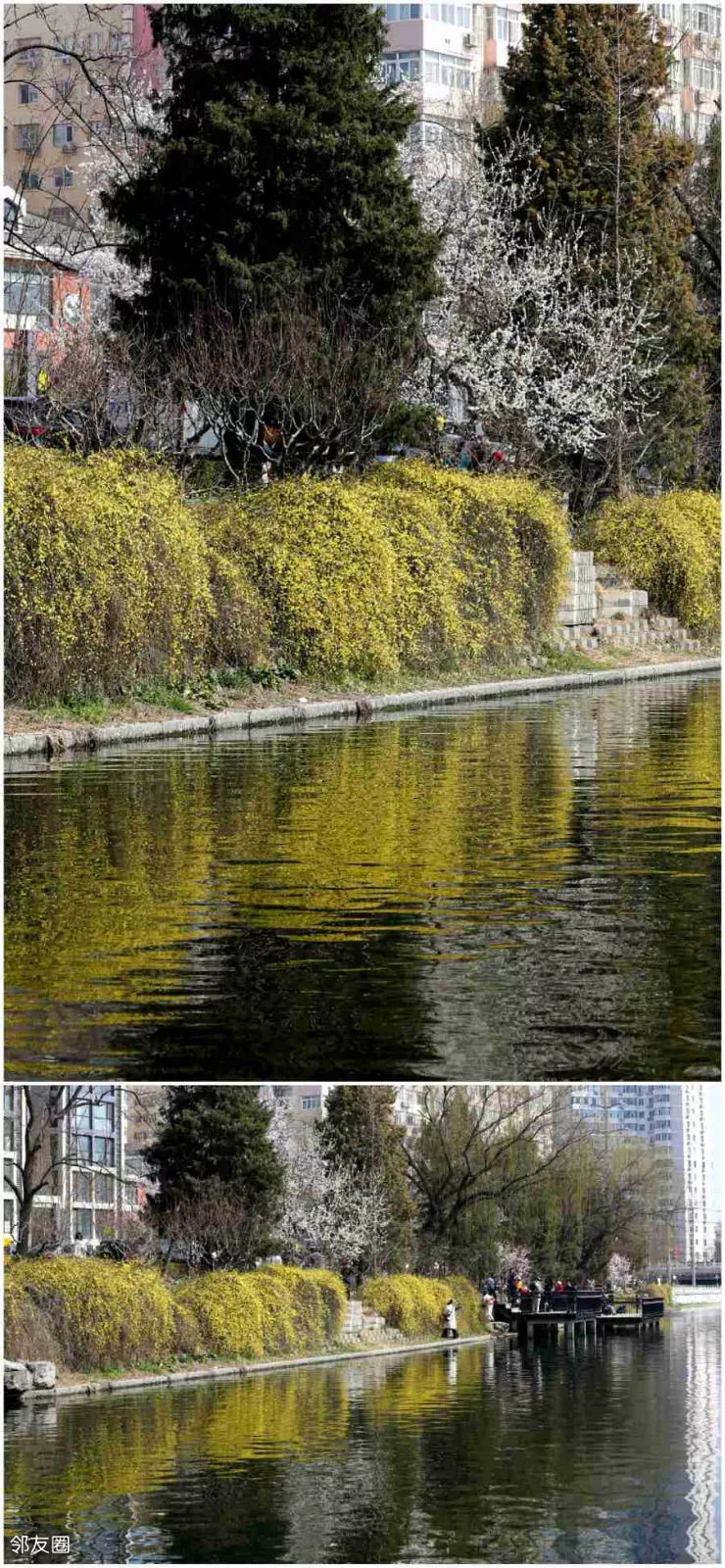 哄了半天才算和好了,又一起游弋在迎春花的倒影里。这场景,美不胜收