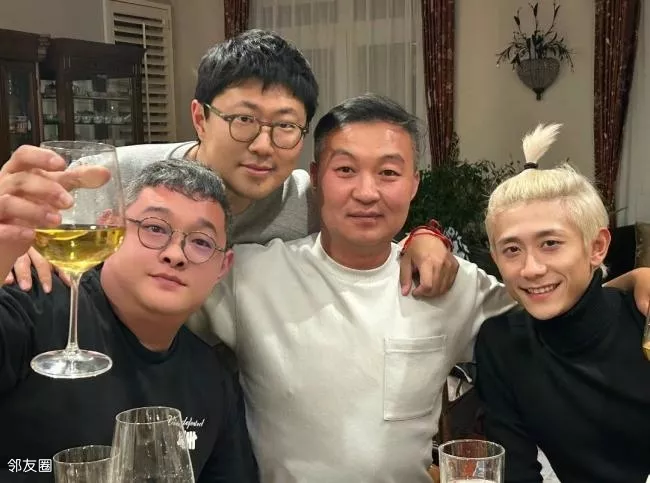 聚餐是过年的常见节目,四个人挤在镜头里,肩膀挨着肩膀,杯子举起来,笑是笑着的。张一山的白发造型挺“少年感”,瘦,利落,表情轻。