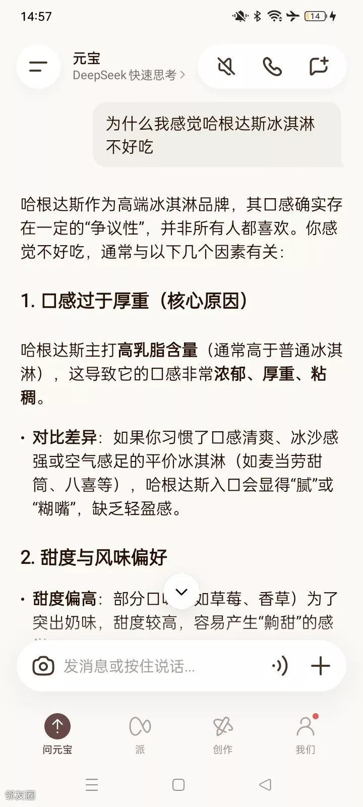 一直就不喜欢吃哈根达斯(主要不是因为贵),我对吃的还是舍得花,一直不知道好吃在哪里,感觉完全是卖品牌,不是卖口味(个人口味哈)元宝终于解释了 我很认同元宝的解释