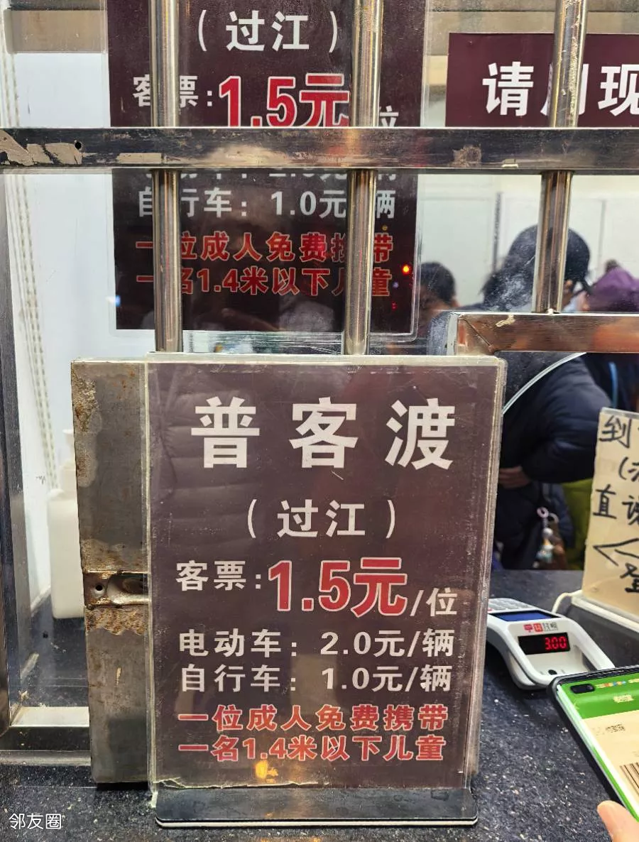 长江轮渡船票1.5元。人员、自行车、电动车一同上船,不仅是传统过江方式,价格也亲密。