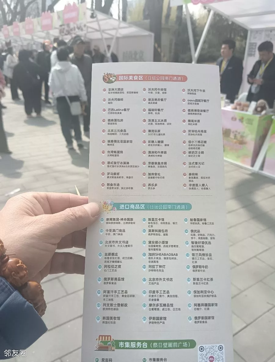 第十九届“春分.朝阳“文化节、第三届北京朝阳花园节暨“时尚北京.爱尚雅宝“3月20日在日坛公园开启,活动至3月25日结束。活动期间公园设置了80个摊位,集结20多个国家源头好物,体验全球市集。有俄罗斯蜂蜜、经典糖果、巧克力;埃塞俄比亚咖啡豆、摩尔多瓦红酒、及各国特产、美食。