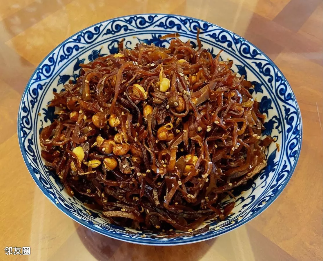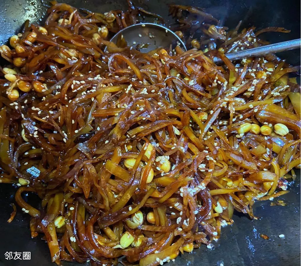 调料就加白糖、少加点老式酱油或者生抽、再加入红烧酱油即可(炒颜色红润、颜色深一点有食欲)。盐千万不要再加了,再加盐先前泡水的过程就白费了……炒至锅底无汤汁,即可出锅……