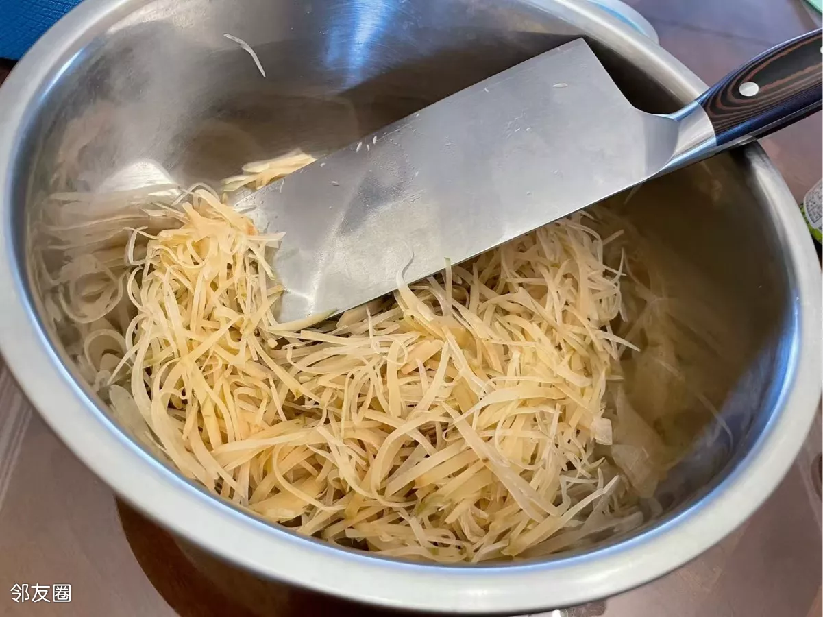 手工切丝,网购有切好的疙瘩丝,也可以选择不切的,网购的疙瘩丝是用机器切的,没有自己手工切的炒出来的好吃……