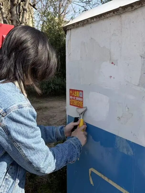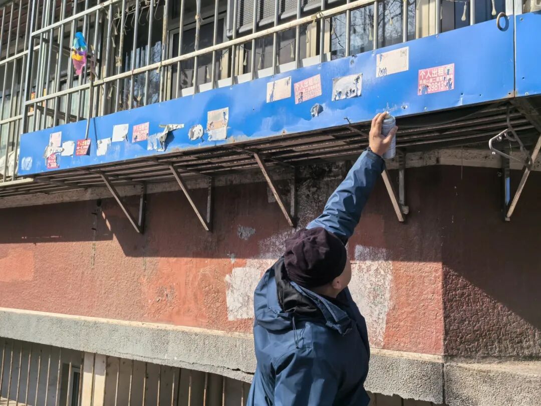 行动现场,整治队伍分工明确、协同配合,携带铲刀、除胶剂、喷壶、抹布、清洁刷等专业工具,针对不同类型小广告精准施策:对于纸质粘贴类小广告,先用除胶剂浸湿软化,再用铲刀细致铲除,最后擦拭干净残留胶印;对于喷涂类顽固小广告,采用专用清洁试剂反复擦拭,最大限度还原墙面与设施原貌;对于楼道拐角、电表箱、管道缝隙等隐蔽角落,工作人员弯腰俯身、细致排查,坚决做到发现一处、清理一处、洁净一处。同时,各社区加大巡查力度,及时制止违规张贴行为,坚决杜绝“清理后反弹”现象,确保整治成效常态保持。