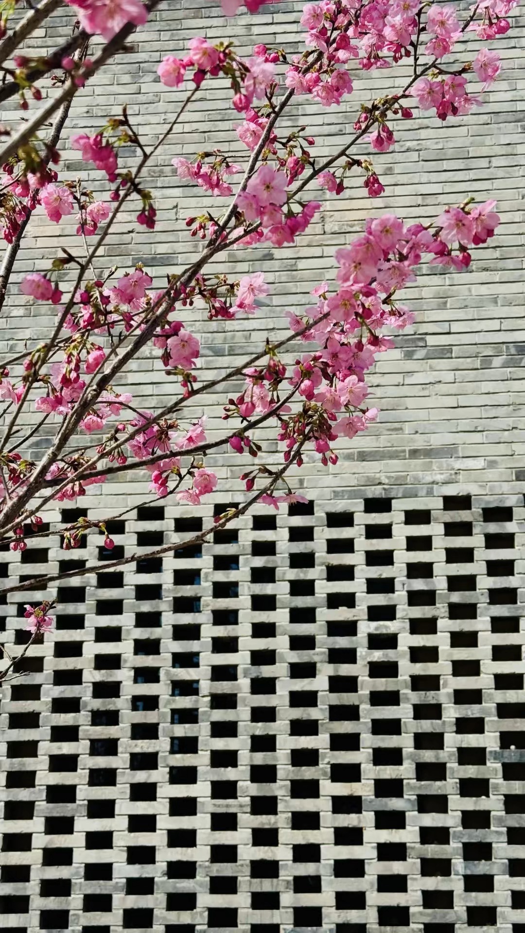 阳光正好,春风不燥,灰墙粉花,赏心悦目。