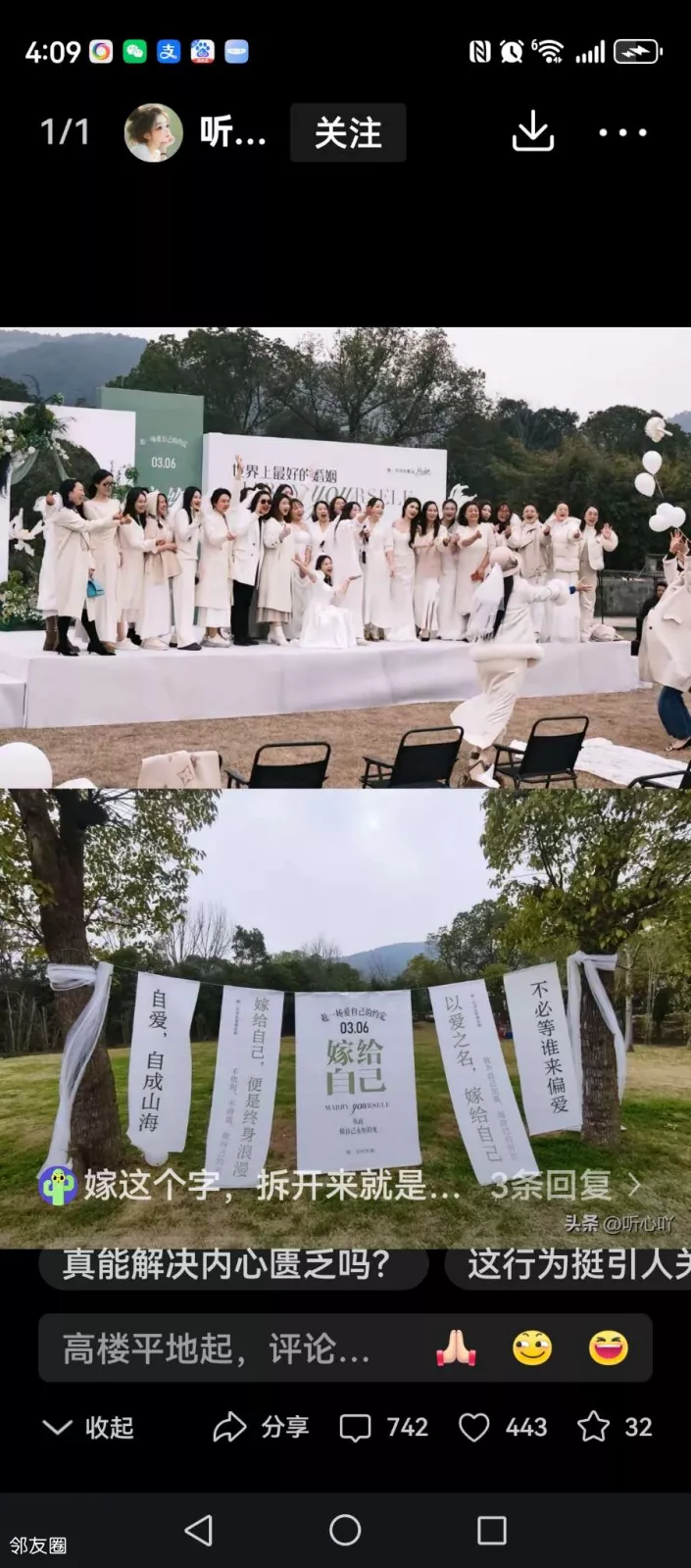 一群大龄单身女性,跑去搞了个集体婚礼,大张旗鼓地宣誓“自己娶自己”。横幅扯得挺唯美——世界上最好的婚姻,就是嫁给自己。
